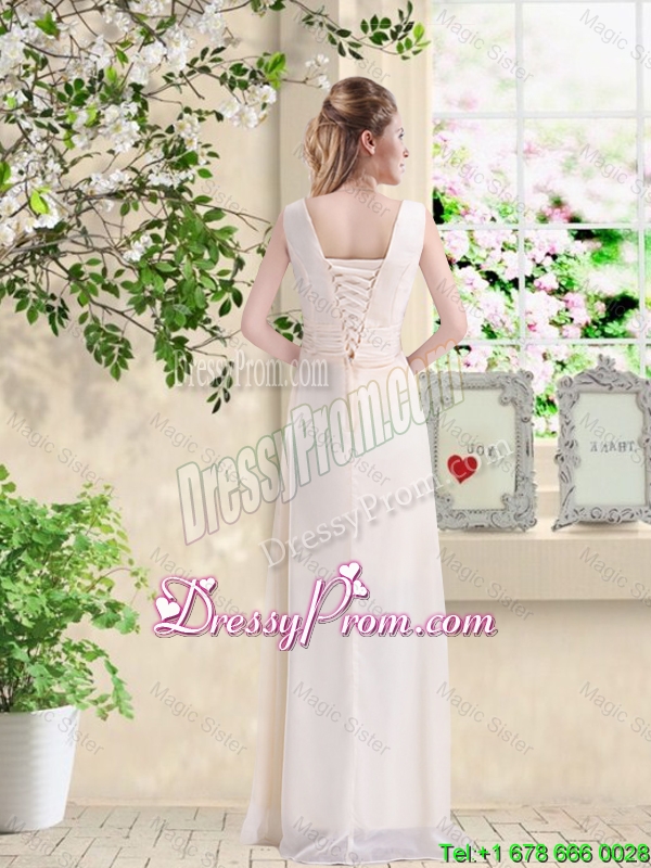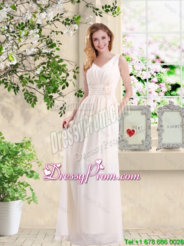 Neckline : V-neckShown Color : ChampagneSilhouette : EmpireSleeve Length : sleevelessHemline : floor lengthBack Detail : Lace upFabric : ChiffonEmbellishment : Hand Made FlowerOccasion : Prom,Party,Homecoming,Wedding PartySeason : Spring,Summer,Fall,Winter