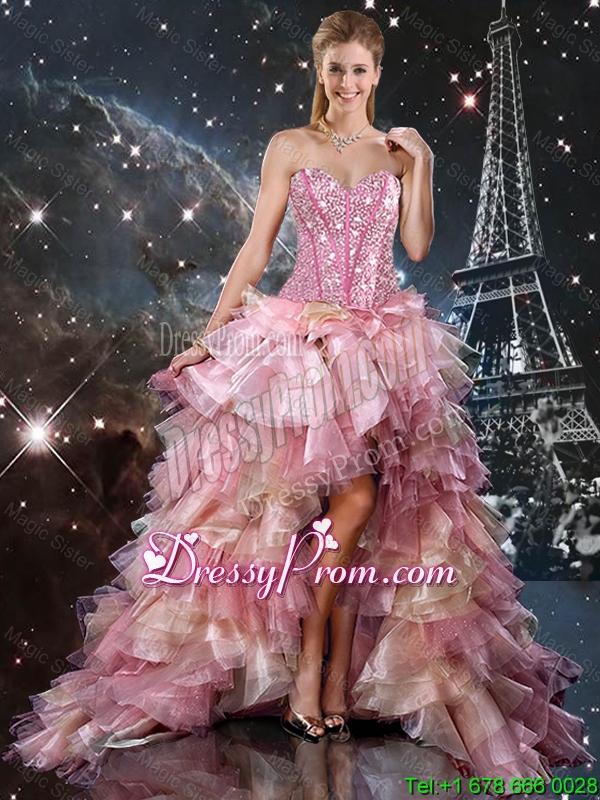 Neckline : SweetheartShown Color : Multi-colorSilhouette : A-lineSleeve Length : sleevelessHemline : high lowBack Detail : Lace upFabric : OrganzaEmbellishment : Beading,RufflesOccasion : Prom,Party,Cocktail,Homecoming,GraduationSeason : Spring,Summer,Fall,Winter