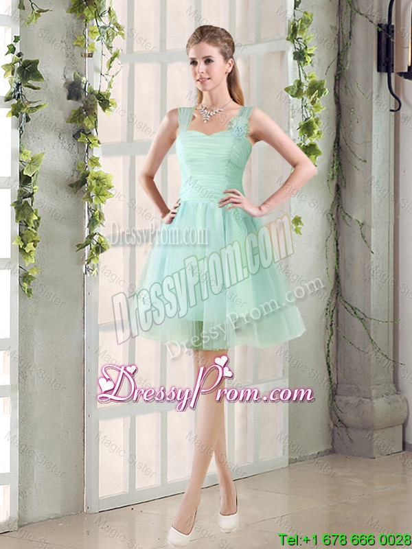 Neckline : Straps Shown Color : Apple Green Silhouette : A-line Sleeve Length : sleeveless Hemline : mini length Back Detail : Lace up Fabric : Tulle Embellishment : Ruching,Hand Made Flower Occasion : Prom,Party,Homecoming,Wedding Party Season : Spring,Summer,Fall