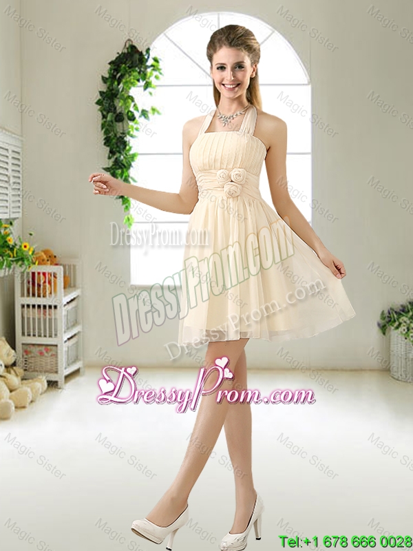 Modern Halter Top Champagne Prom Dresses with Hand Made Flowers