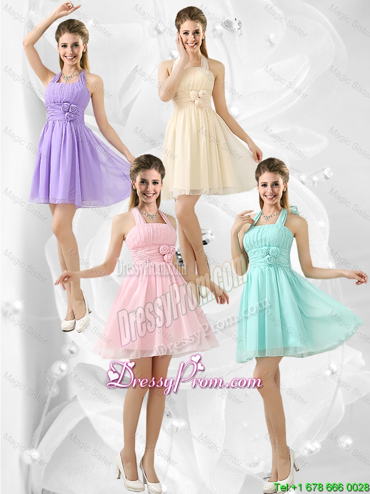 Neckline : Halter top Shown Color : Champagne Silhouette : Short Sleeve Length : sleeveless Hemline : mini length Back Detail : Zipper Fabric : Chiffon Embellishment : Ruching,Hand Made Flower Occasion : Prom,Party,Cocktail,Homecoming,Graduation,Wedding Party Season : Spring,Summer,Fall