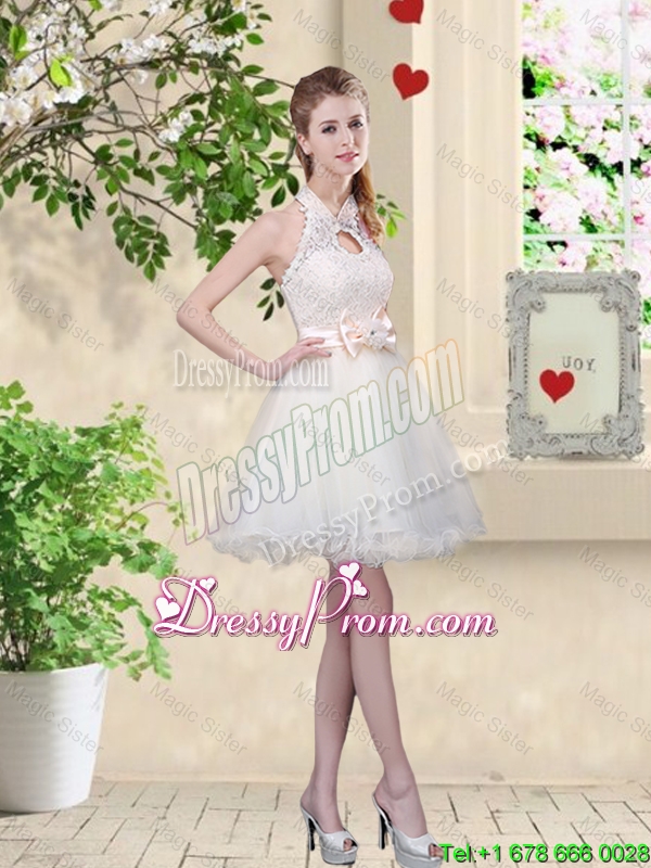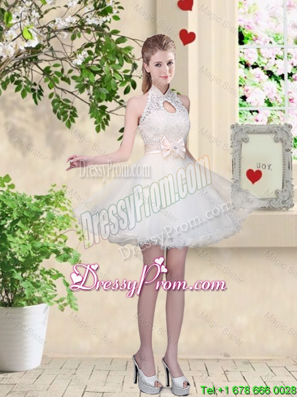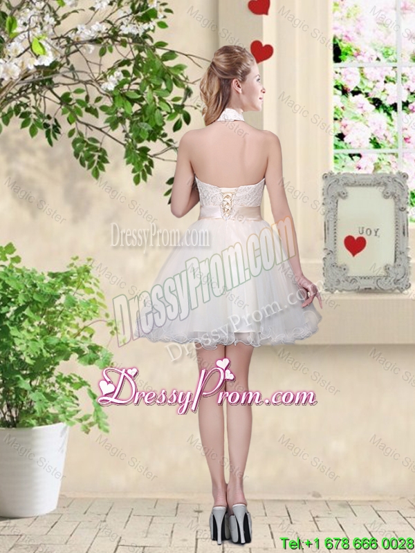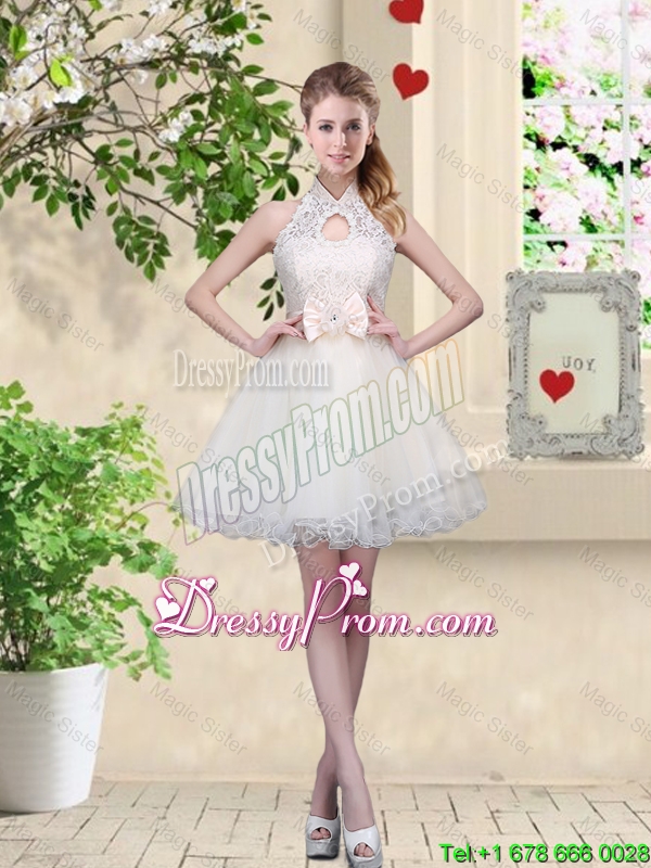 Neckline : Halter topShown Color : ChampagneSilhouette : A-lineSleeve Length : sleevelessHemline : mini lengthBack Detail : Lace upFabric : OrganzaEmbellishment : Lace,BowknotOccasion : Prom,Party,Cocktail,Homecoming,Graduation,Wedding PartySeason : Spring,Summer,Fall