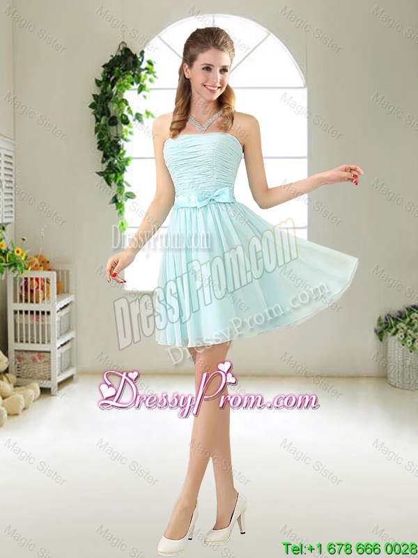 Neckline : StraplessShown Color : Light BlueSilhouette : A-lineSleeve Length : sleevelessHemline : mini lengthBack Detail : ZipperFabric : ChiffonEmbellishment : Ruching,BowknotOccasion : Prom,Party,Cocktail,Homecoming,Graduation,Wedding PartySeason : Spring,Summer,Fall
