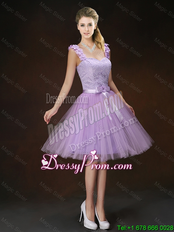 Neckline : ScoopShown Color : LavenderSilhouette : ShortSleeve Length : sleevelessHemline : knee lengthBack Detail : Lace upFabric : TulleEmbellishment : Lace,Appliques,Bowknot,Belt,Hand Made FlowerOccasion : Prom,Party,Cocktail,Homecoming,Graduation,Wedding PartySeason : Spring,Summer,Fall