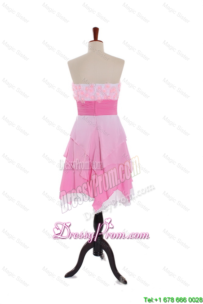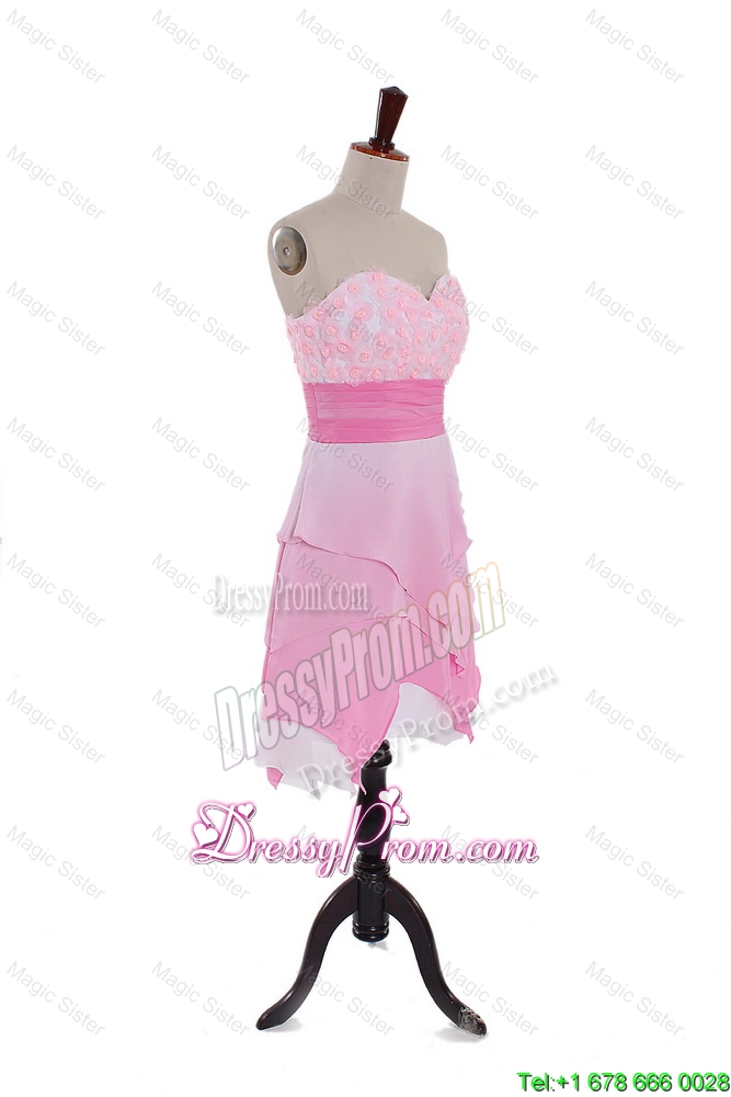 Neckline : SweetheartSilhouette : EmpireSleeve Length : sleevelessHemline : knee lengthBack Detail : ZipperFabric : ChiffonEmbellishment : Hand Made FlowerOccasion : Prom,Party,Cocktail,Homecoming,HolidaySeason : Spring,Summer,Fall