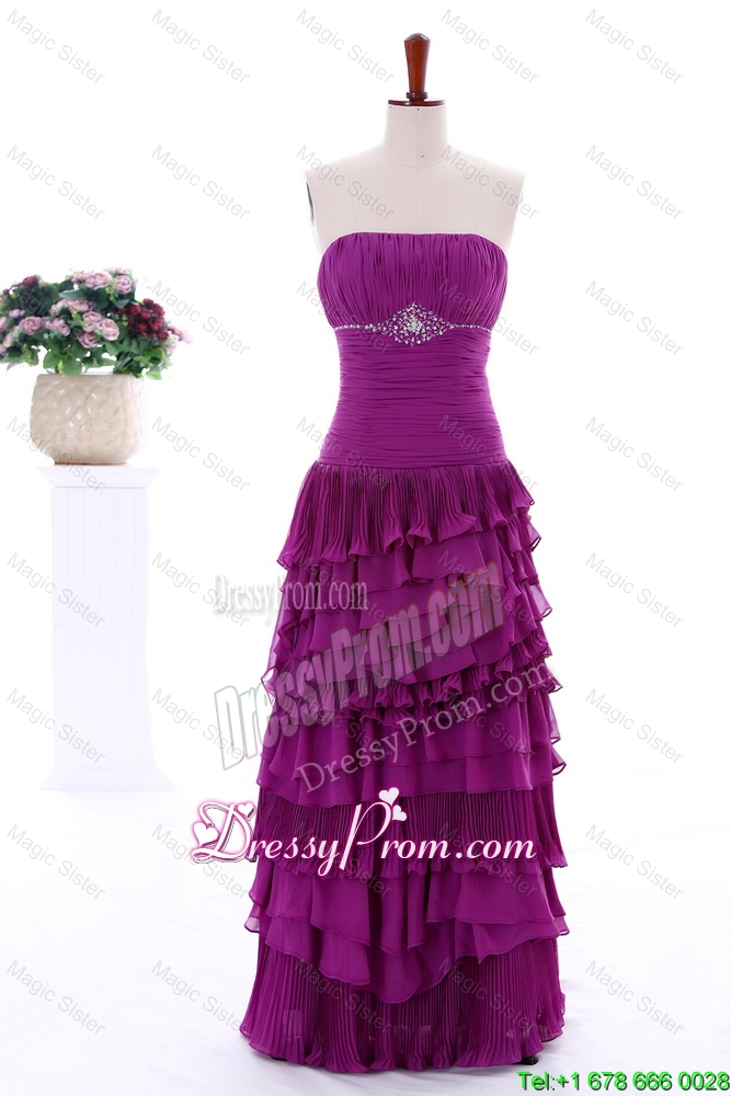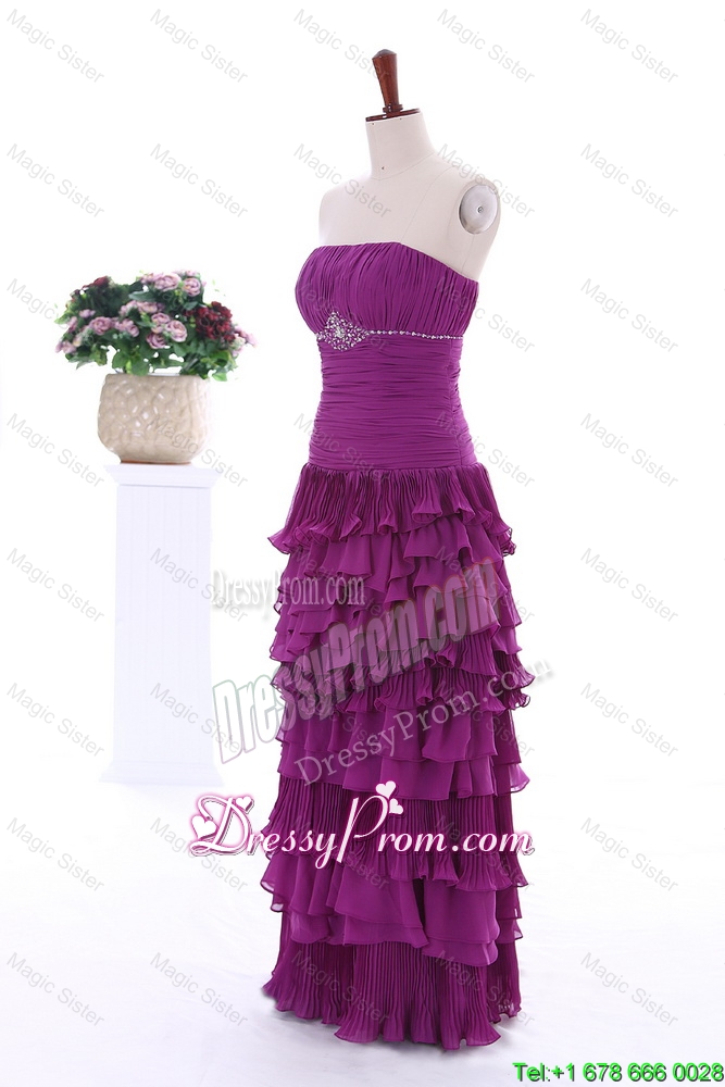 Neckline : StraplessShown Color : Eggplant PurpleSilhouette : Column/SheathSleeve Length : sleevelessHemline : floor lengthBack Detail : ZipperFabric : ChiffonEmbellishment : Beading,Ruffled LayersOccasion : Prom,Formal Evening,Homecoming,Graduation,HolidaySeason : Spring,Fall,Winter