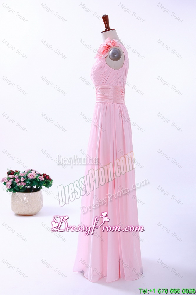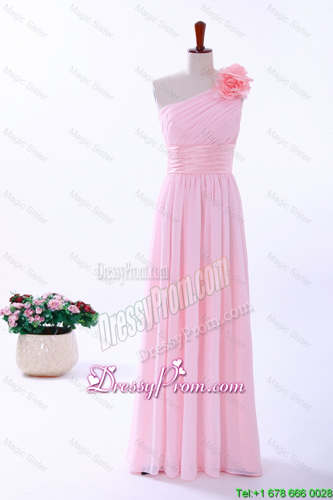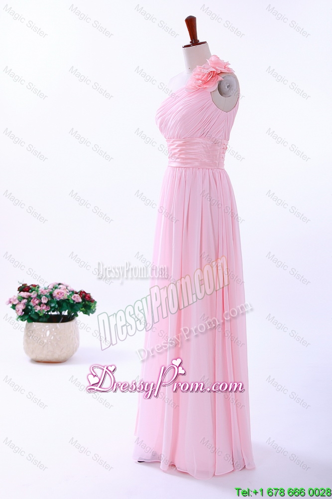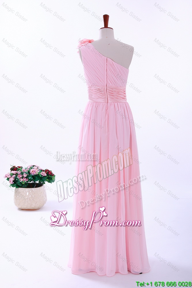 Neckline : One shoulderShown Color : Baby PinkSilhouette : EmpireSleeve Length : sleevelessHemline : floor lengthBack Detail : ZipperFabric : ChiffonEmbellishment : Hand Made FlowerOccasion : Prom,Formal Evening,Homecoming,Graduation,HolidaySeason : Spring,Summer,Fall,Winter