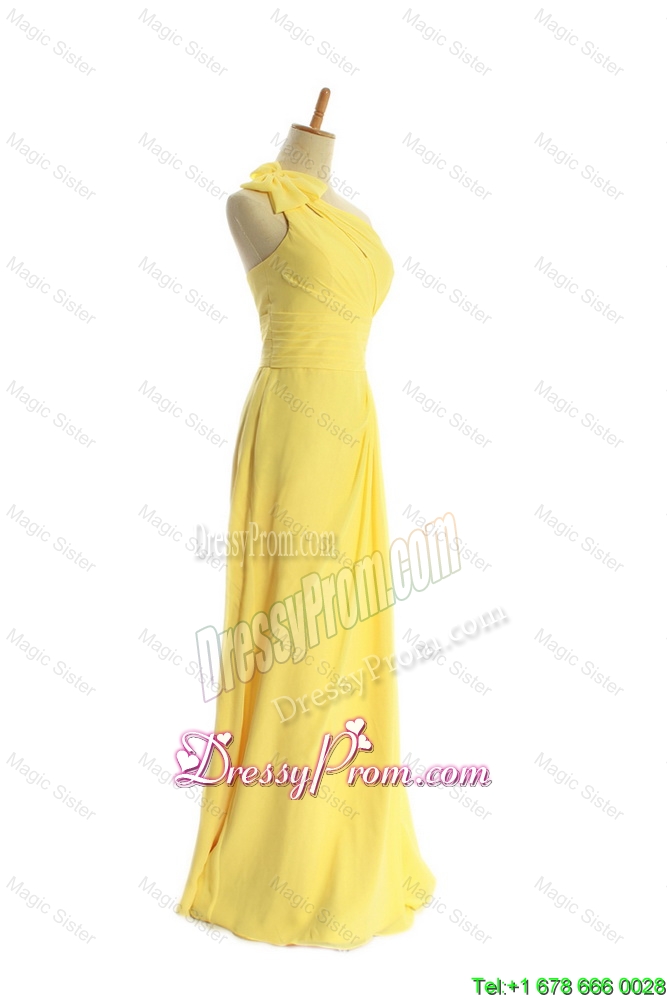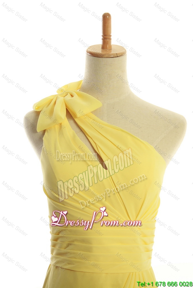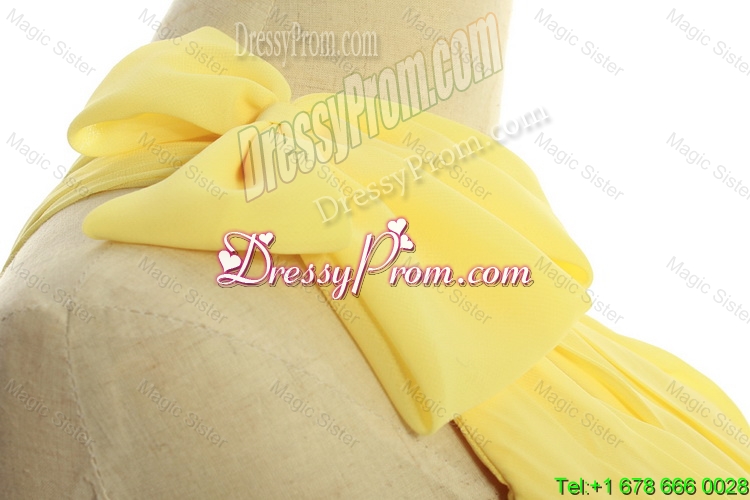 Neckline : One shoulderShown Color : YellowSilhouette : EmpireSleeve Length : sleevelessHemline : floor lengthBack Detail : ZipperFabric : ChiffonEmbellishment : BowknotOccasion : Prom,Formal Evening,Graduation,Pageant,HolidaySeason : Spring,Summer,Fall,Winter