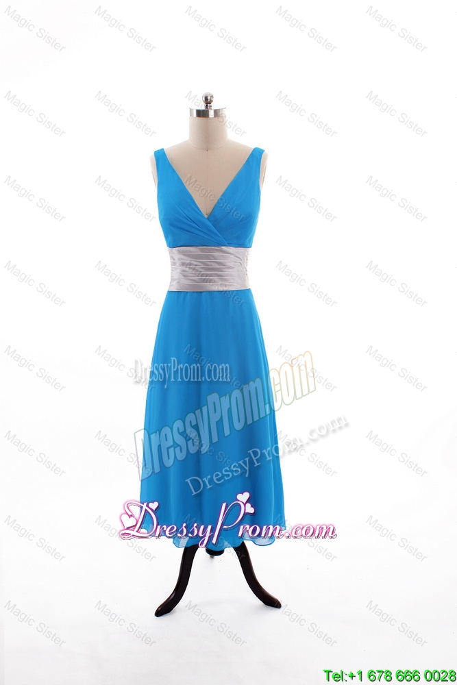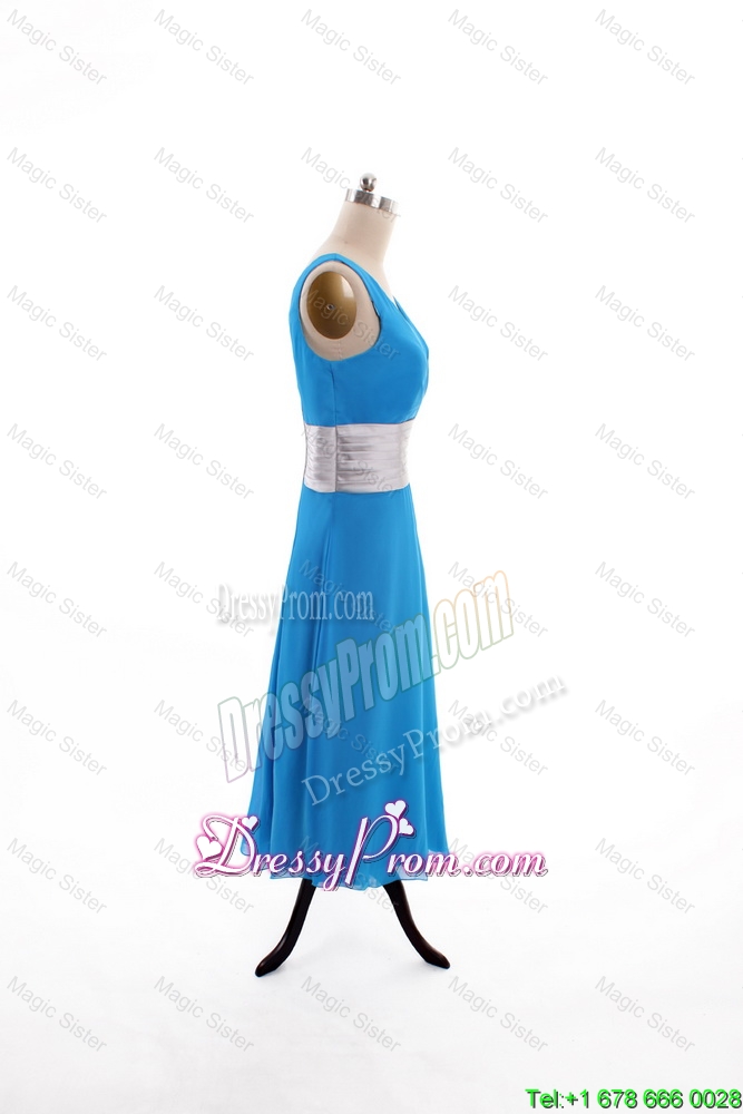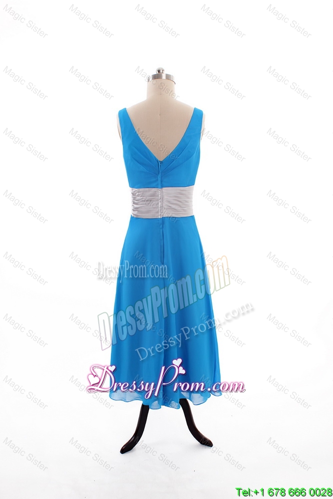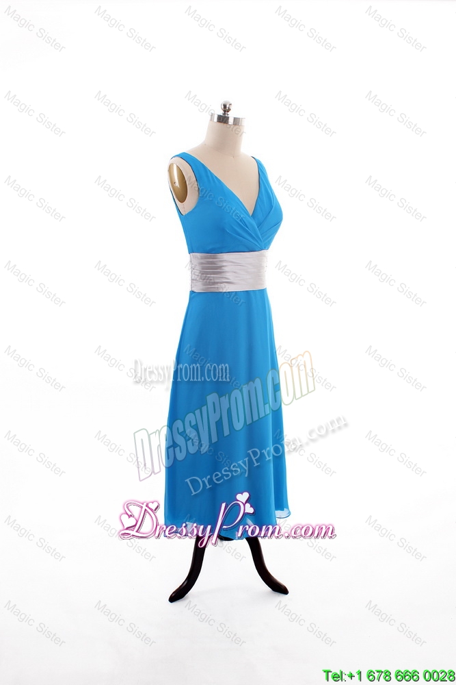 Neckline : V-neckShown Color : BlueSilhouette : EmpireSleeve Length : sleevelessHemline : tea lengthBack Detail : ZipperFabric : ChiffonEmbellishment : BeltOccasion : Prom,Party,Cocktail,Homecoming,Graduation,HolidaySeason : Spring,Summer,Fall