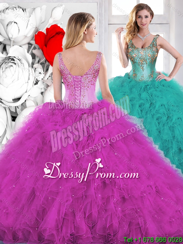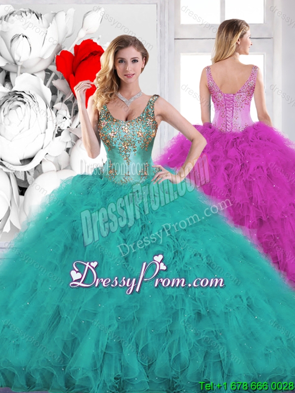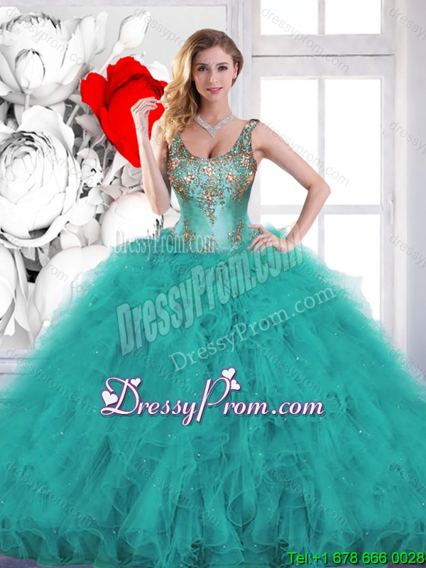 Neckline : ScoopShown Color : Teal Silhouette : Ball GownsSleeve Length : sleevelessHemline : floor lengthBack Detail : Lace upFabric : OrganzaEmbellishment : Beading,RufflesOccasion : Military Ball,Sweet 16,QuinceaneraSeason : Spring,Summer,Fall,Winter