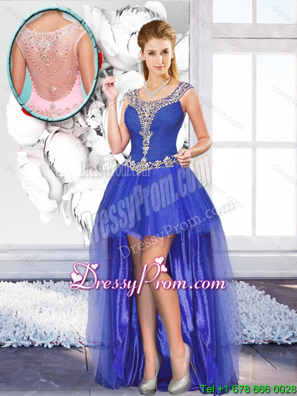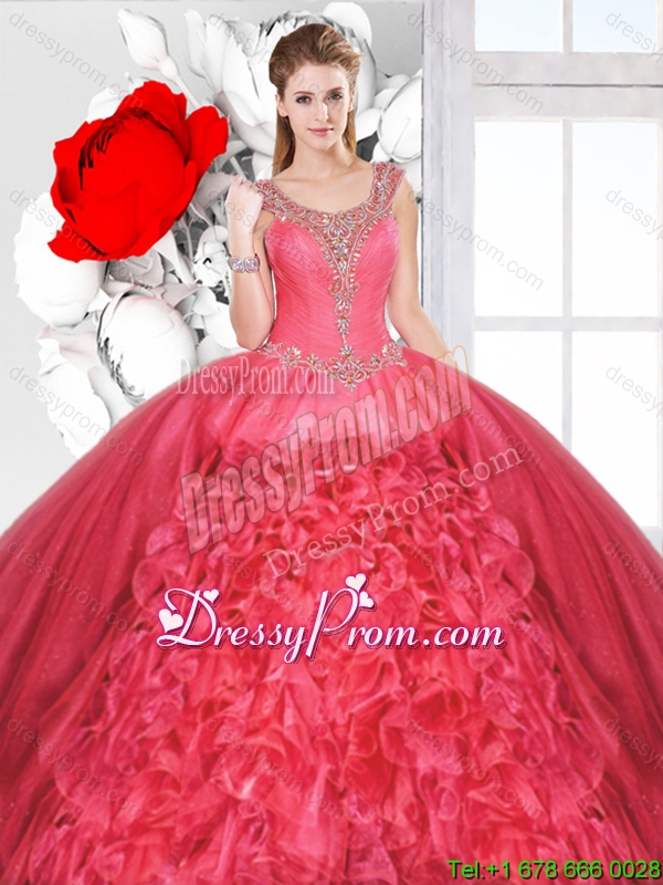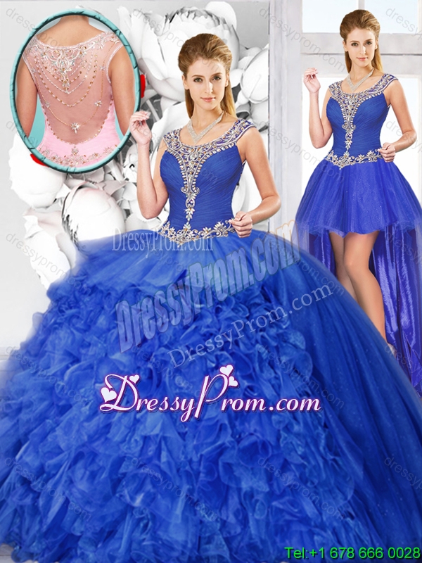 Neckline : ScoopShown Color : Royal BlueSilhouette : Ball GownsSleeve Length : sleevelessHemline : floor lengthBack Detail : Side zipperFabric : Organza,TulleEmbellishment : Beading,RufflesOccasion : Military Ball,Sweet 16,QuinceaneraSeason : Spring,Summer,Fall,Winter