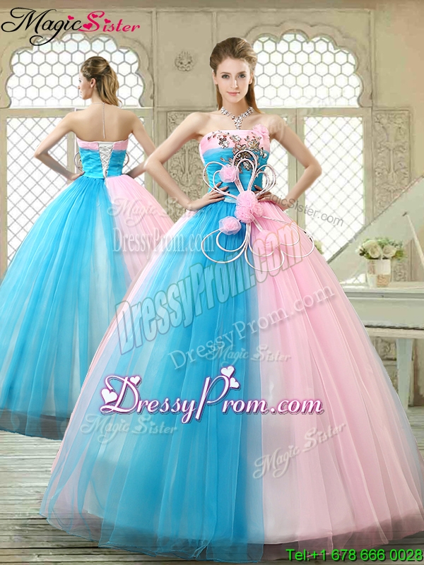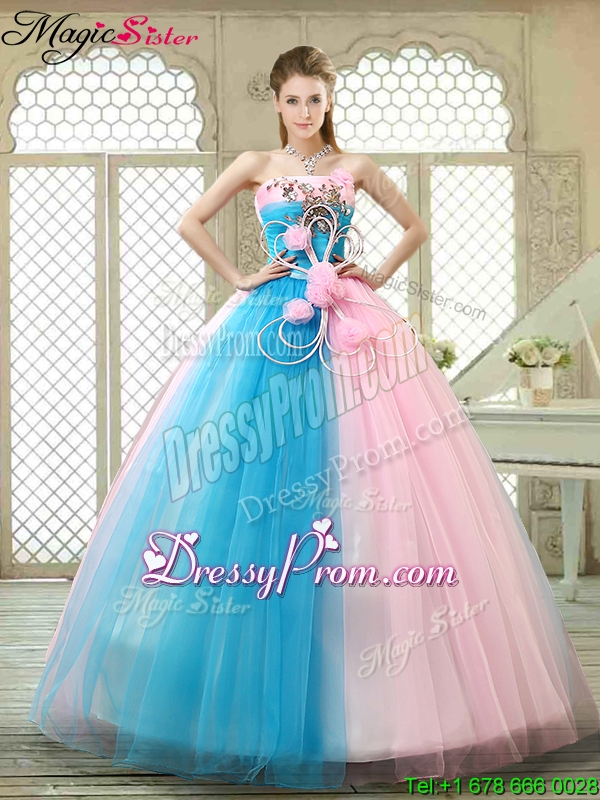 Neckline : StraplessSilhouette : Ball GownsSleeve Length : sleevelessHemline : floor lengthBack Detail : Lace upFabric : TulleEmbellishment : Hand Made FlowerOccasion : Military Ball,Sweet 16,QuinceaneraSeason : Spring,Summer,Fall,Winter