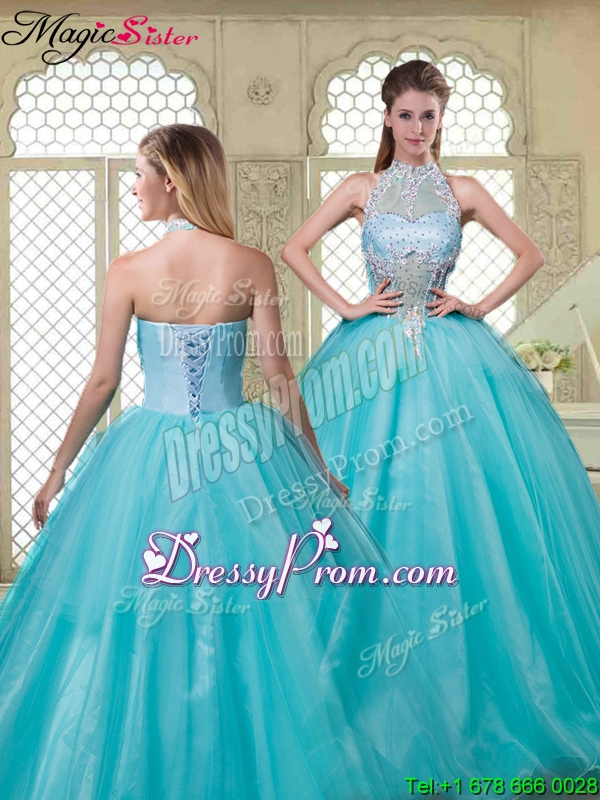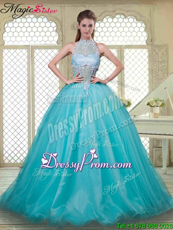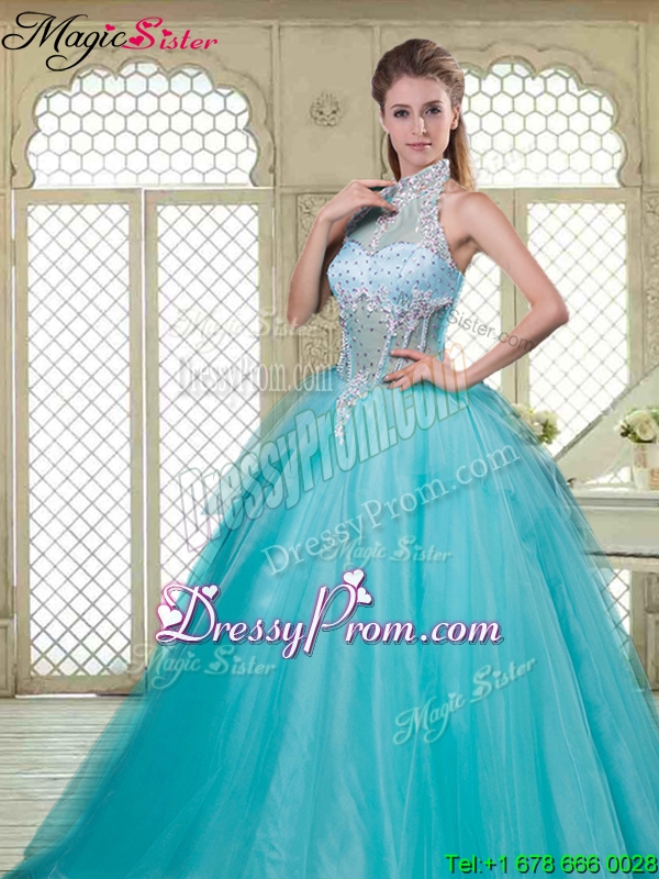Neckline : Halter top Shown Color : Aqua Blue Silhouette : Ball Gowns Sleeve Length : sleeveless Hemline : with train Back Detail : Lace up Fabric : Tulle Embellishment : Beading Occasion : Military Ball,Sweet 16,Quinceanera Season : Spring,Summer,Fall,Winter