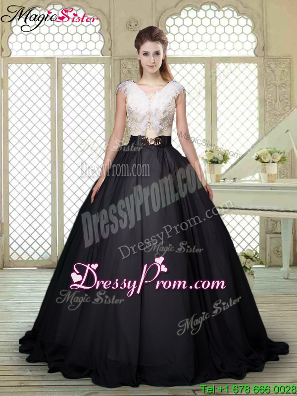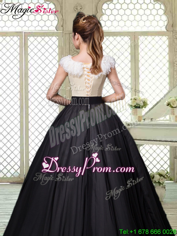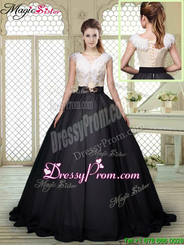 Neckline : V-neck Shown Color : White And Black Silhouette : Ball Gowns Sleeve Length : cap sleeves Hemline : with train Back Detail : Lace up Fabric : Taffeta Embellishment : Bowknot Occasion : Military Ball,Sweet 16,Quinceanera Season : Spring,Summer,Fall,Winter