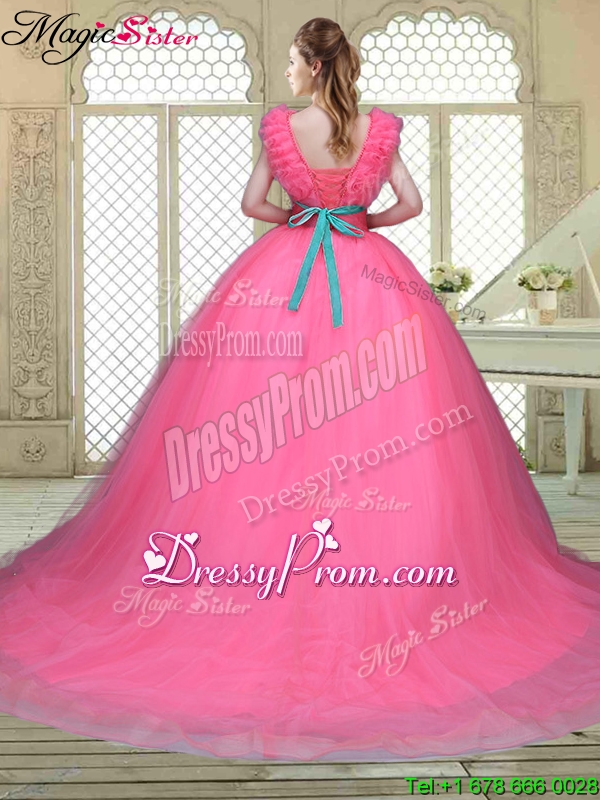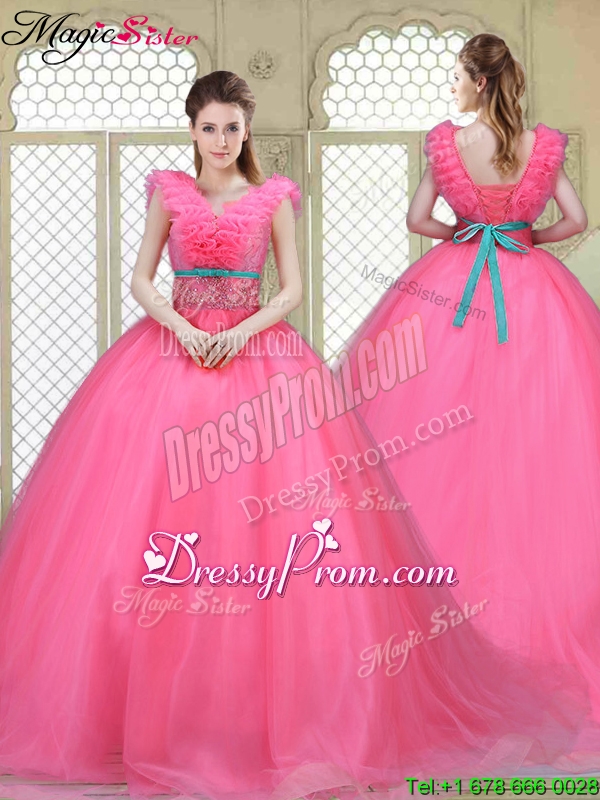 Neckline : V-neckShown Color : Hot PinkSilhouette : Ball GownsSleeve Length : sleevelessHemline : with trainBack Detail : Lace upFabric : TulleEmbellishment : Beading,Ruffles,BeltOccasion : Military Ball,Sweet 16,QuinceaneraSeason : Spring,Summer,Fall,Winter