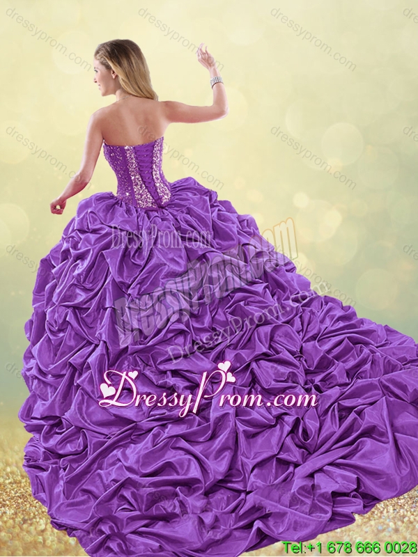 Neckline : SweetheartShown Color : PurpleSilhouette : Ball GownsSleeve Length : sleevelessHemline : with trainBack Detail : Lace upFabric : TaffetaEmbellishment : BeadingOccasion : Military Ball,Sweet 16,QuinceaneraSeason : Spring,Summer,Fall,Winter