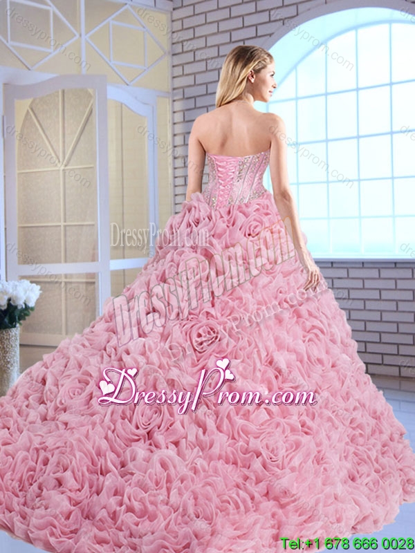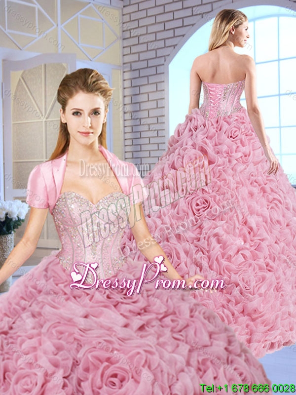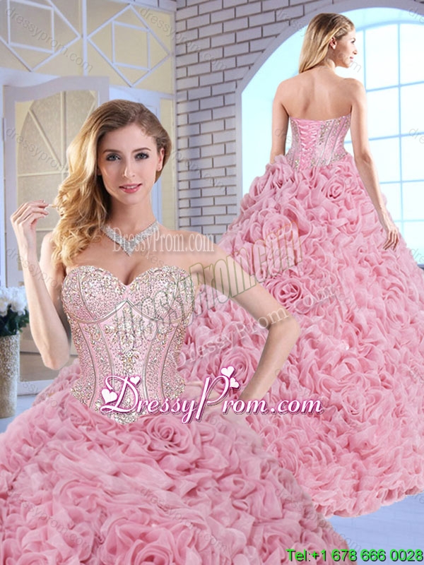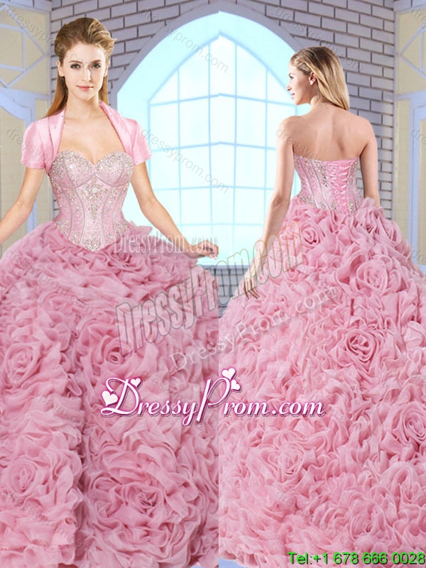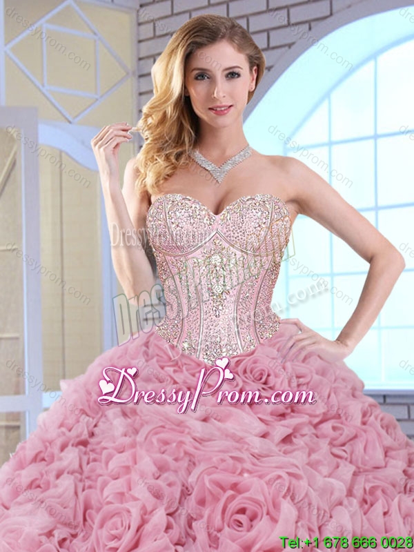 Neckline : SweetheartShown Color : Rose Pink Silhouette : Ball GownsSleeve Length : sleevelessHemline : floor lengthBack Detail : Lace upFabric : Fabric With Rolling FlowersEmbellishment : BeadingOccasion : Military Ball,Sweet 16,QuinceaneraSeason : Spring,Summer,Fall,Winter