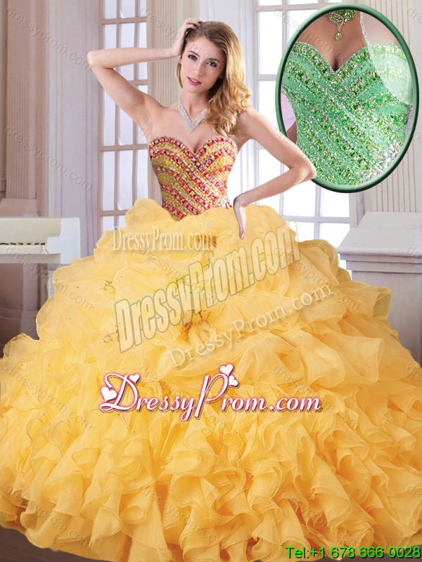 Neckline : SweetheartShown Color : GoldSilhouette : Ball GownsSleeve Length : sleevelessHemline : floor lengthBack Detail : Lace upFabric : OrganzaEmbellishment : Beading,RufflesOccasion : Military Ball,Sweet 16,QuinceaneraSeason : Spring,Summer,Fall,Winter