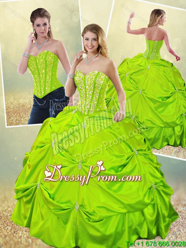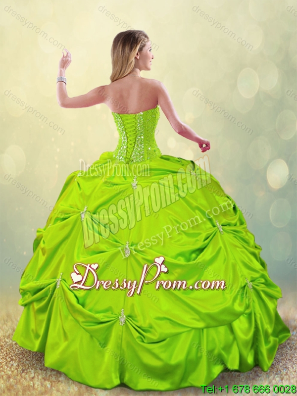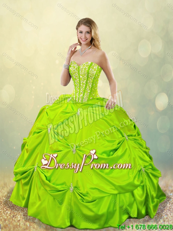 Neckline : SweetheartShown Color : Spring GreenSilhouette : Ball GownsSleeve Length : sleevelessHemline : floor lengthBack Detail : Lace upFabric : TaffetaEmbellishment : BeadingOccasion : Military Ball,Sweet 16,QuinceaneraSeason : Spring,Summer,Fall,Winter