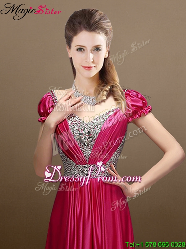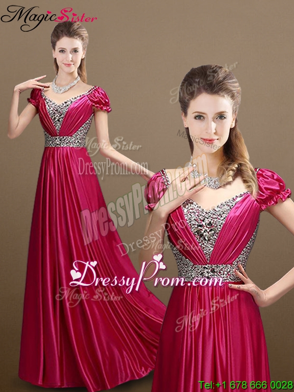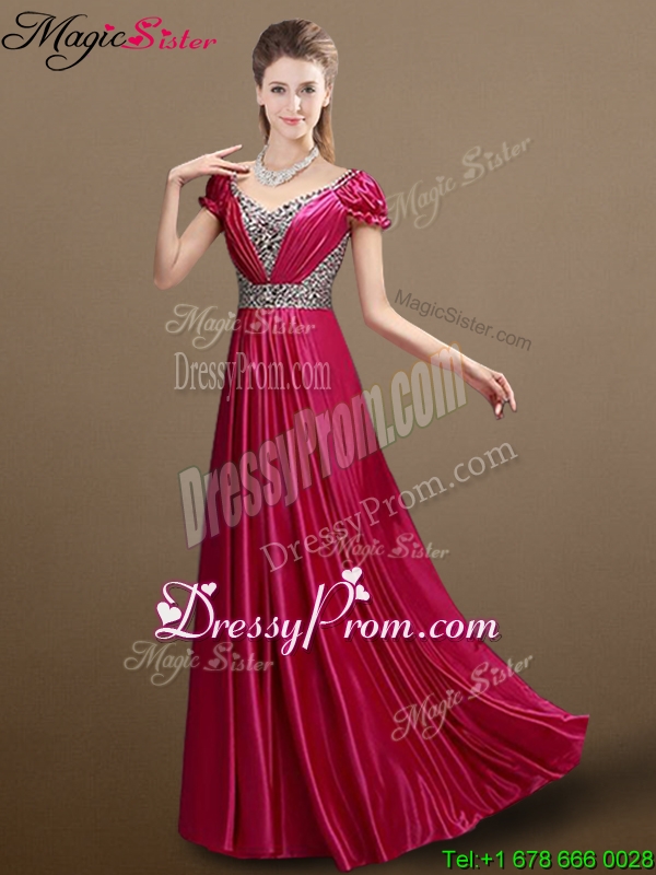 Neckline : V-neckShown Color : Wine RedSilhouette : EmpireSleeve Length : short sleevesHemline : floor lengthBack Detail : Lace upFabric : Elastic Woven SatinEmbellishment : BeadingOccasion : Prom,Formal Evening,Homecoming,Graduation,Pageant,HolidaySeason : Spring,Summer,Fall,Winter