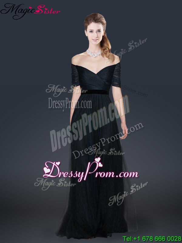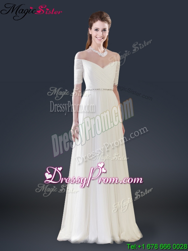 Neckline : Off the shoulderShown Color : White,BlackSilhouette : EmpireSleeve Length : short sleevesHemline : floor lengthBack Detail : Lace upFabric : TulleEmbellishment : BeadingOccasion : Prom,Formal Evening,Homecoming,Graduation,Pageant,HolidaySeason : Spring,Summer,Fall,Winter