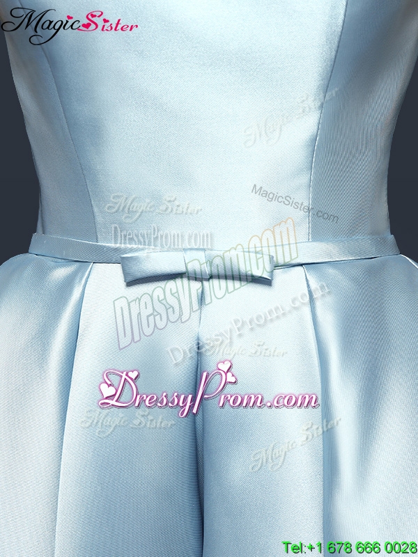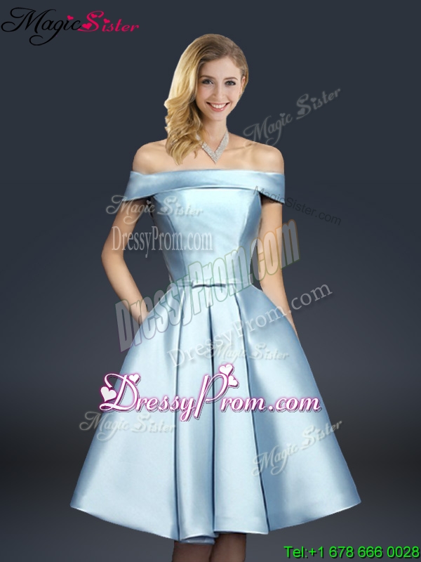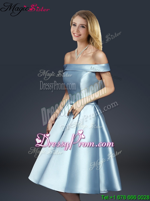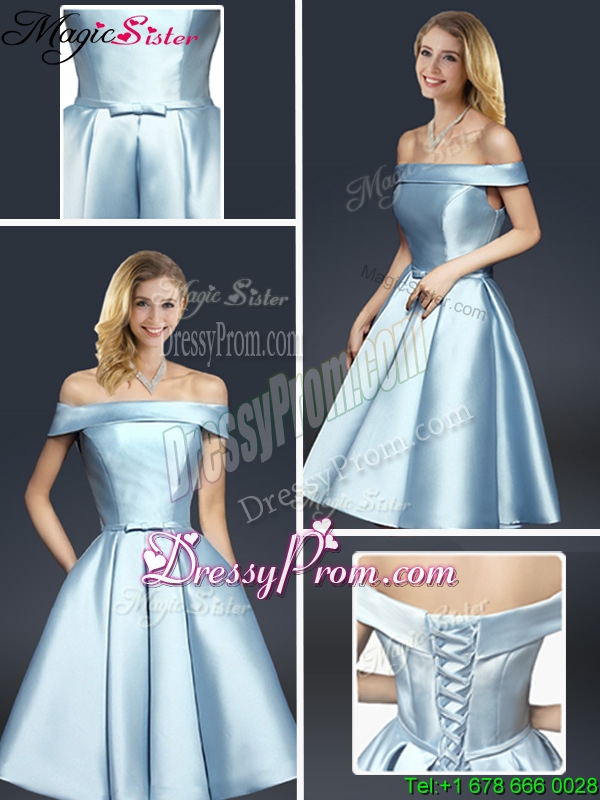 Neckline : Off the shoulderShown Color : Baby BlueSilhouette : A-lineSleeve Length : sleevelessHemline : knee lengthBack Detail : Lace upFabric : SatinEmbellishment : Ruching,BowknotOccasion : Prom,Party,Homecoming,Graduation,HolidaySeason : Spring,Summer,Fall