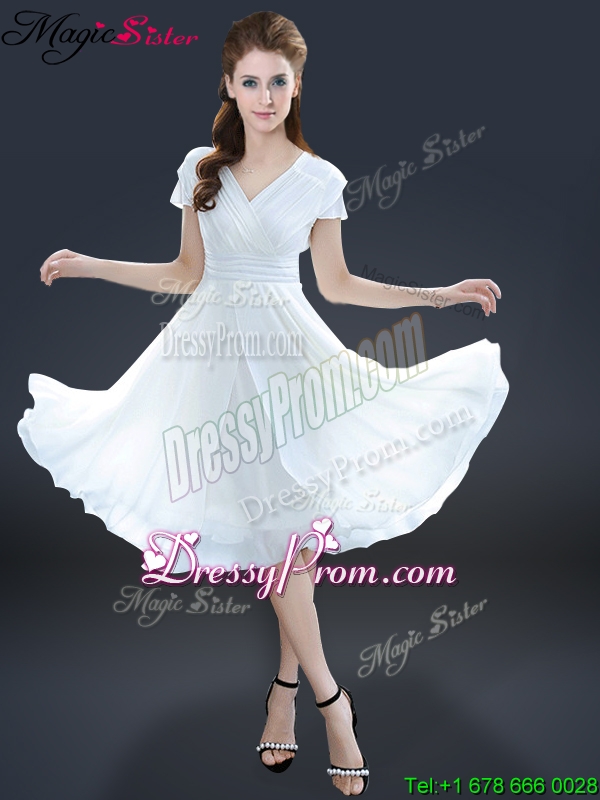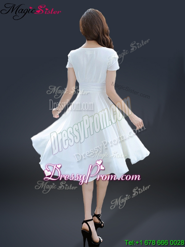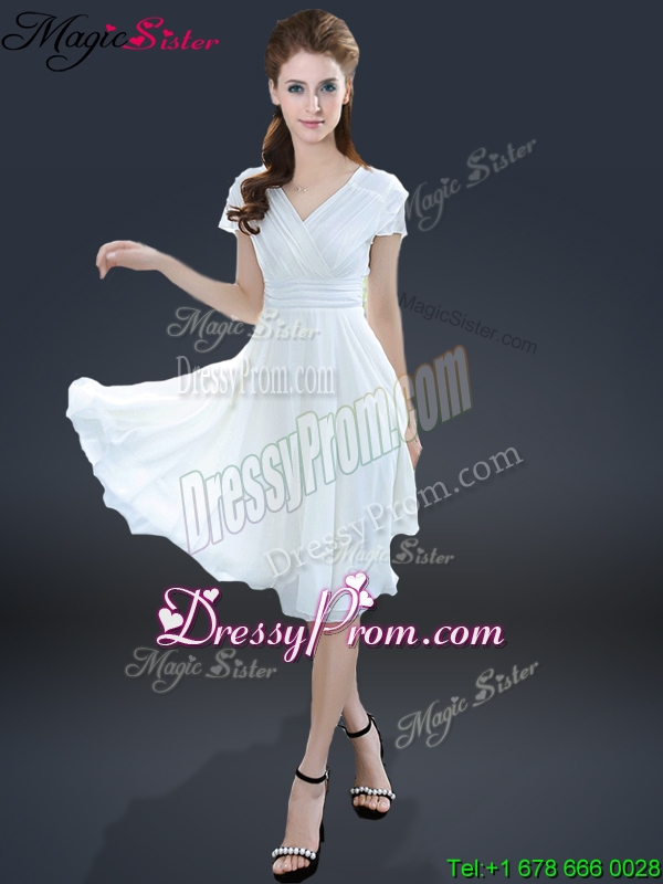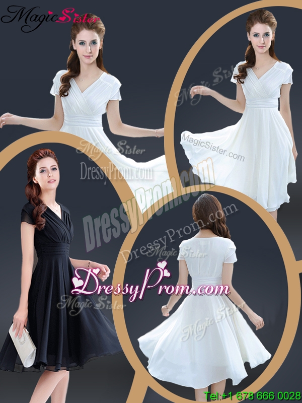 Neckline : V-neckShown Color : White,BlackSilhouette : ShortSleeve Length : short sleevesHemline : knee lengthBack Detail : Side zipperFabric : ChiffonEmbellishment : RuchingOccasion : Prom,Party,Cocktail,Homecoming,Graduation,HolidaySeason : Spring,Summer,Fall
