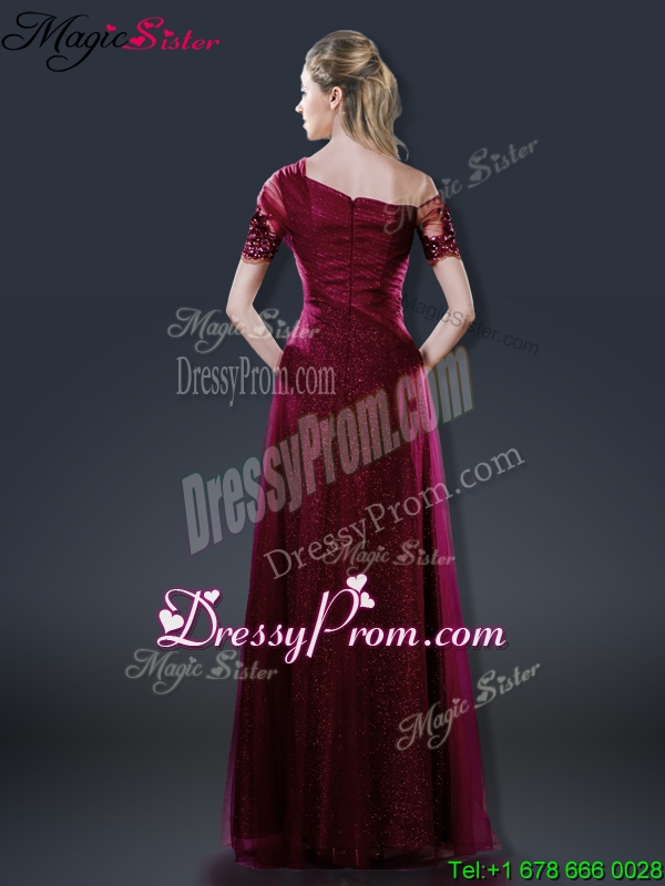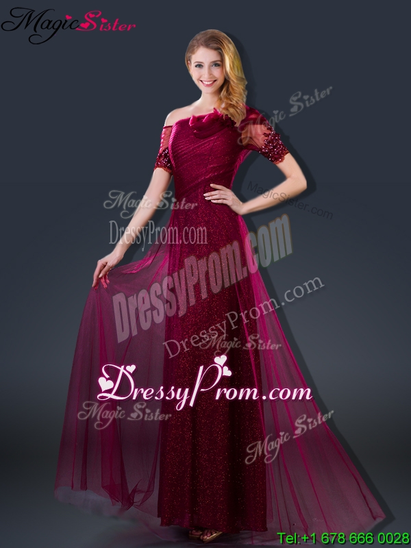 Neckline : AsymmetricShown Color : Wine RedSilhouette : EmpireSleeve Length : short sleevesHemline : floor lengthBack Detail : ZipperFabric : TulleEmbellishment : AppliquesOccasion : Prom,Formal Evening,Homecoming,Graduation,Pageant,HolidaySeason : Spring,Summer,Fall,Winter