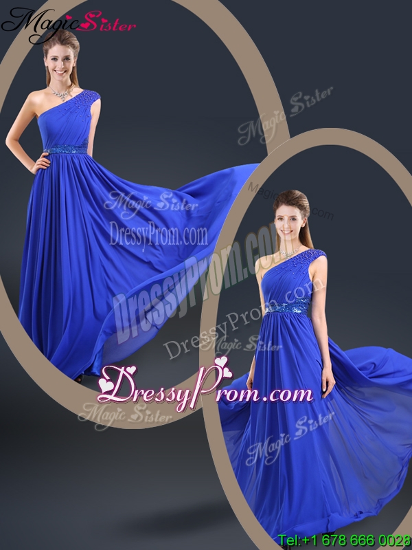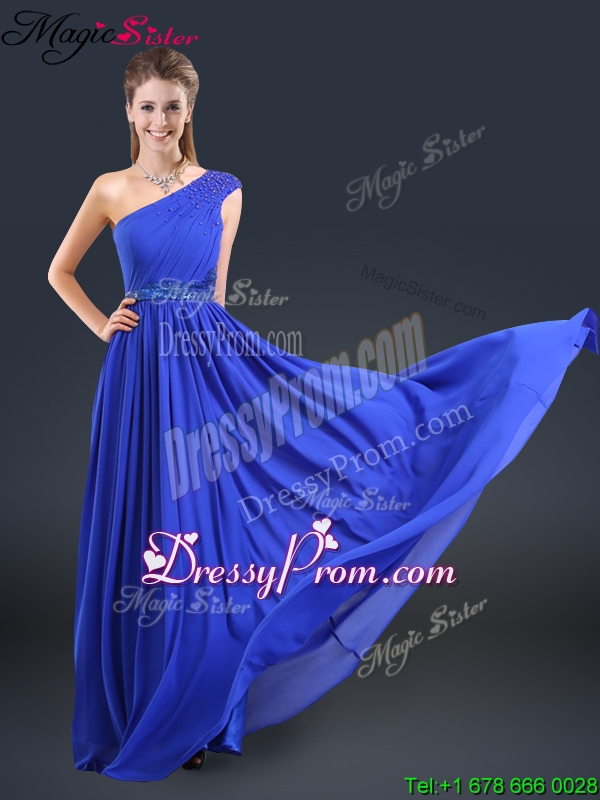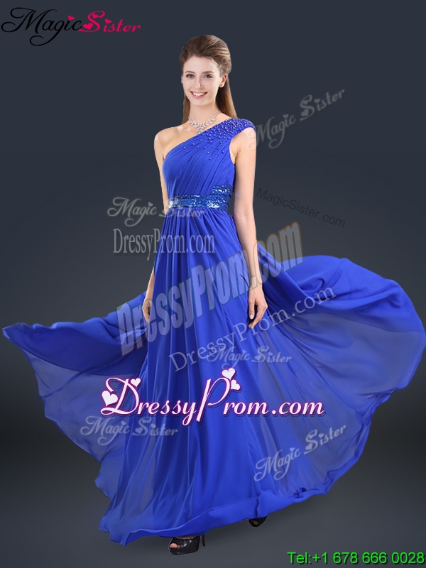 Neckline : One shoulderShown Color : BlueSilhouette : EmpireSleeve Length : sleevelessHemline : floor lengthBack Detail : ZipperFabric : ChiffonEmbellishment : BeltOccasion : Prom,Formal Evening,Homecoming,Graduation,Pageant,HolidaySeason : Spring,Summer,Fall,Winter