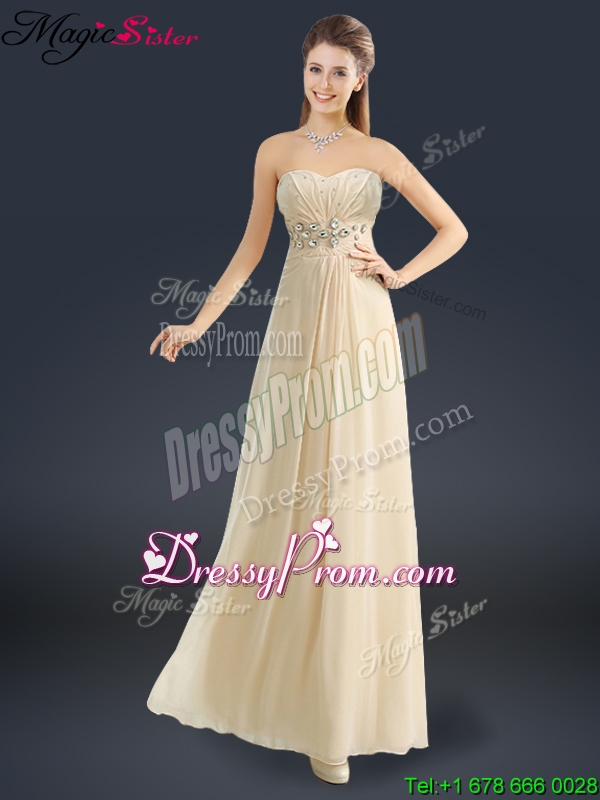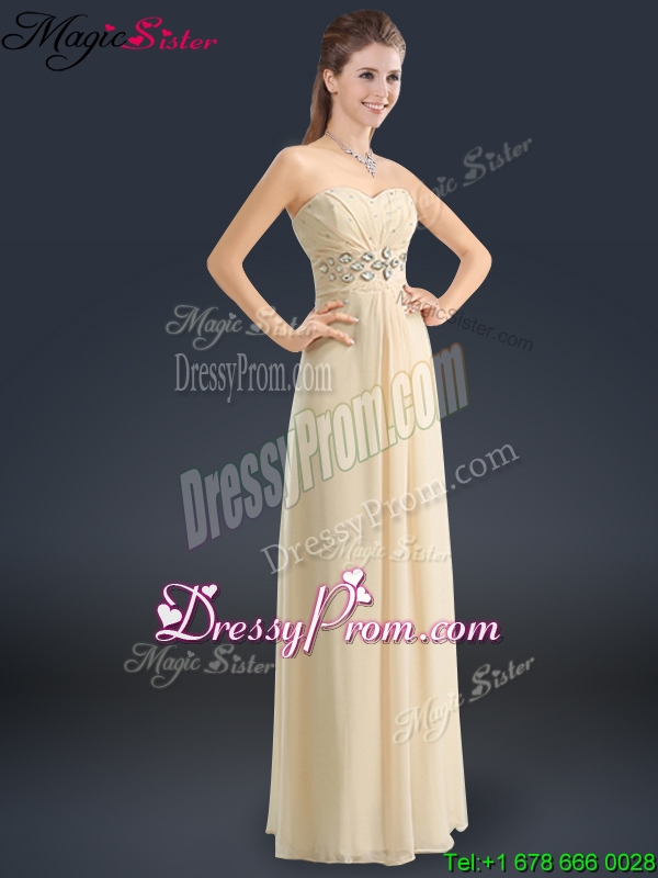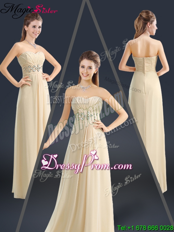 Neckline : SweetheartShown Color : ChampagneSilhouette : EmpireSleeve Length : sleevelessHemline : floor lengthBack Detail : ZipperFabric : ChiffonEmbellishment : BeadingOccasion : Prom,Formal Evening,Homecoming,Graduation,Pageant,HolidaySeason : Spring,Summer,Fall,Winter