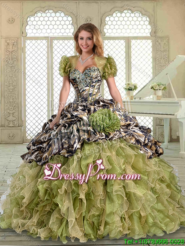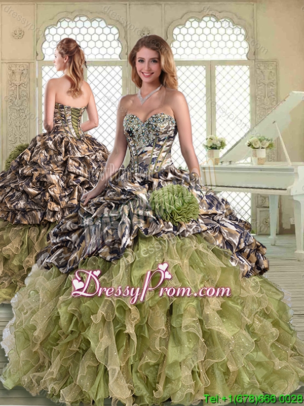 Neckline : SweetheartShown Color : Multi-colorSilhouette : Ball GownsSleeve Length : sleevelessHemline : with trainBack Detail : Lace upFabric : OrganzaEmbellishment : Ruffles,Pick Ups,Hand Made FlowerOccasion : Military Ball,Sweet 16,QuinceaneraSeason : Spring,Summer,Fall,Winter