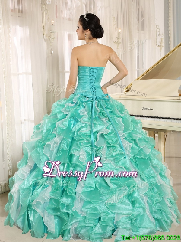 Neckline : SweetheartShown Color : Apple GreenSilhouette : Ball GownsSleeve Length : sleevelessHemline : floor lengthBack Detail : Lace upFabric : OrganzaEmbellishment : Beading,RufflesOccasion : Graduation,Military Ball,Sweet 16,QuinceaneraSeason : Spring,Summer,Fall,Winter