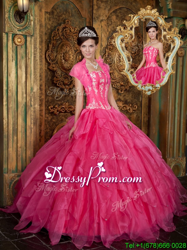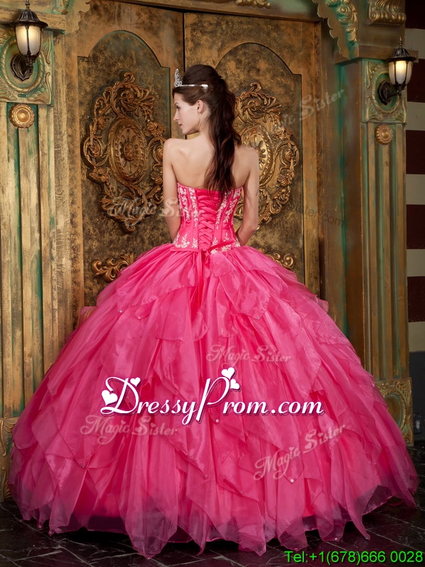 Neckline : StraplessShown Color : Hot PinkSilhouette : Ball GownsSleeve Length : sleevelessHemline : floor lengthBack Detail : Lace upFabric : OrganzaEmbellishment : Appliques,RufflesOccasion : Prom,Military Ball,QuinceaneraSeason : Spring,Summer,Fall,Winter