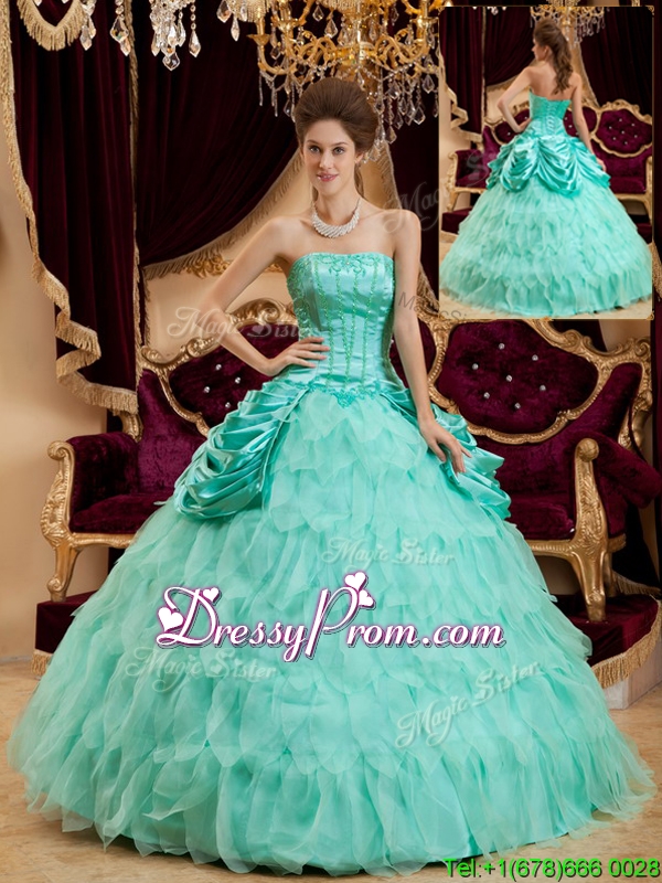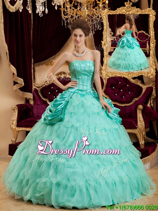 Neckline : StraplessSilhouette : Ball GownsSleeve Length : sleevelessHemline : floor lengthBack Detail : Lace upFabric : Organza,TaffetaEmbellishment : Ruffles,Pick UpsOccasion : Prom,Military Ball,QuinceaneraSeason : Spring,Summer,Fall,Winter