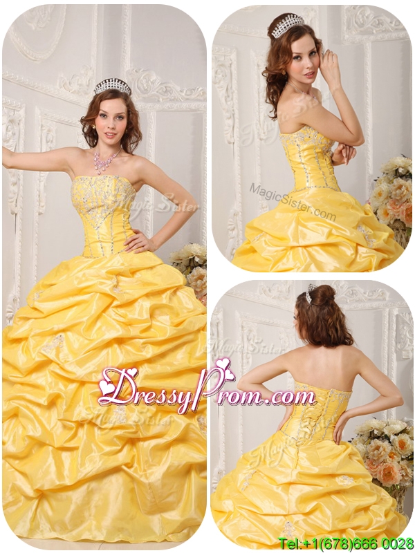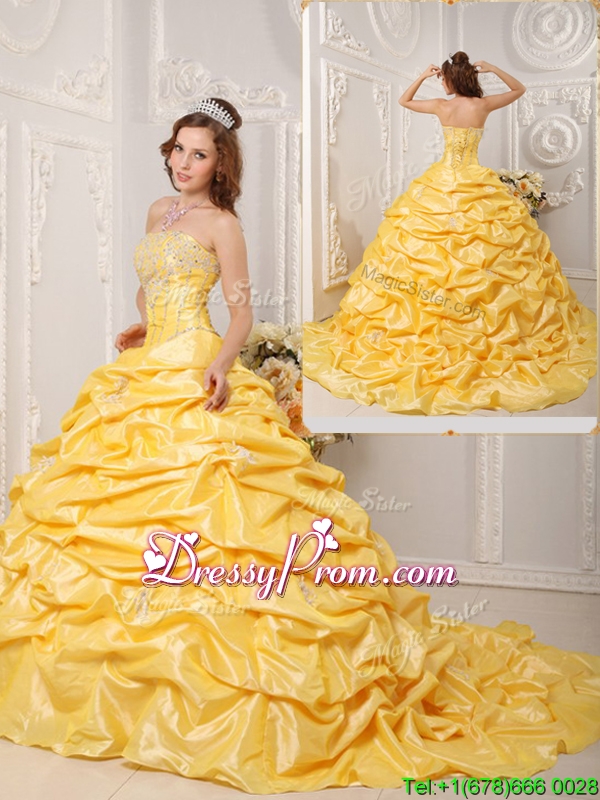 Neckline : StraplessShown Color : YellowSilhouette : Ball GownsSleeve Length : sleevelessHemline : with trainBack Detail : Lace upFabric : TaffetaEmbellishment : Beading,Appliques,Pick UpsOccasion : Prom,Formal Evening,Military Ball,Sweet 16,QuinceaneraSeason : Spring,Summer,Fall,Winter