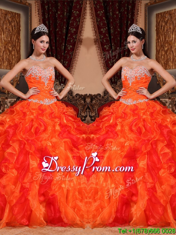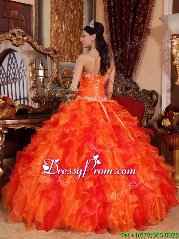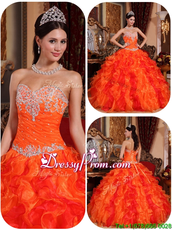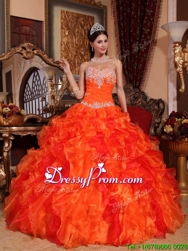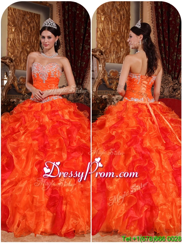 Neckline : SweetheartShown Color : OrangeSilhouette : Ball GownsSleeve Length : sleevelessHemline : floor lengthBack Detail : Lace upFabric : OrganzaEmbellishment : Beading,Appliques,RufflesOccasion : Prom,Formal Evening,Military Ball,QuinceaneraSeason : Spring,Summer,Fall,Winter