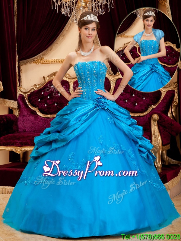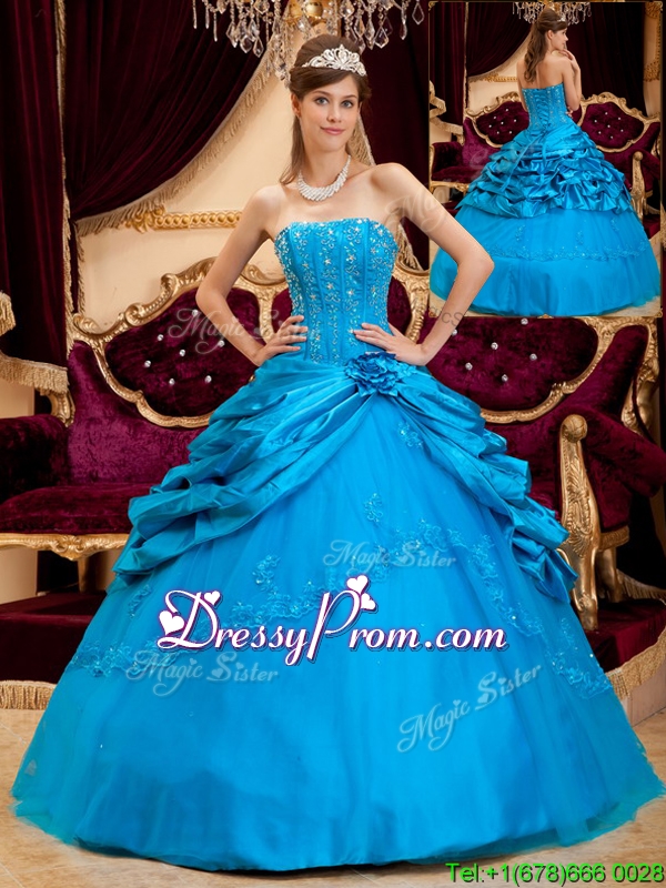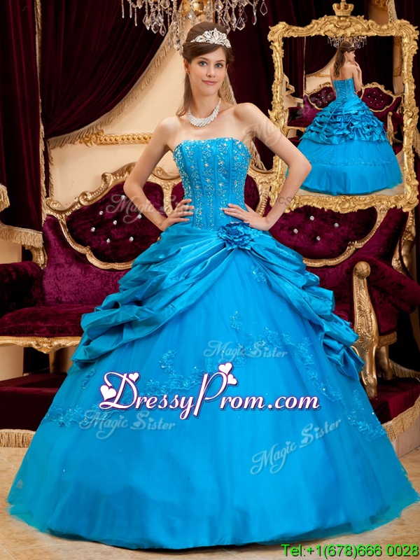 Neckline : StraplessShown Color : Teal Silhouette : Ball GownsSleeve Length : sleevelessHemline : floor lengthBack Detail : Lace upFabric : Taffeta,TulleEmbellishment : Beading,Lace,AppliquesOccasion : Prom,Military Ball,QuinceaneraSeason : Spring,Summer,Fall,Winter