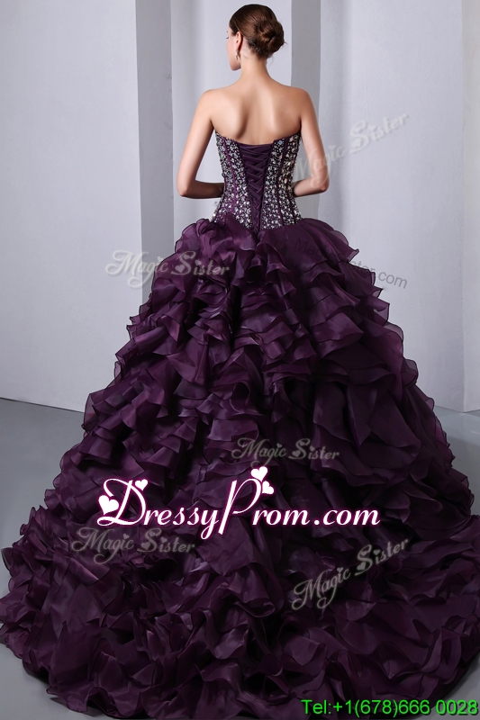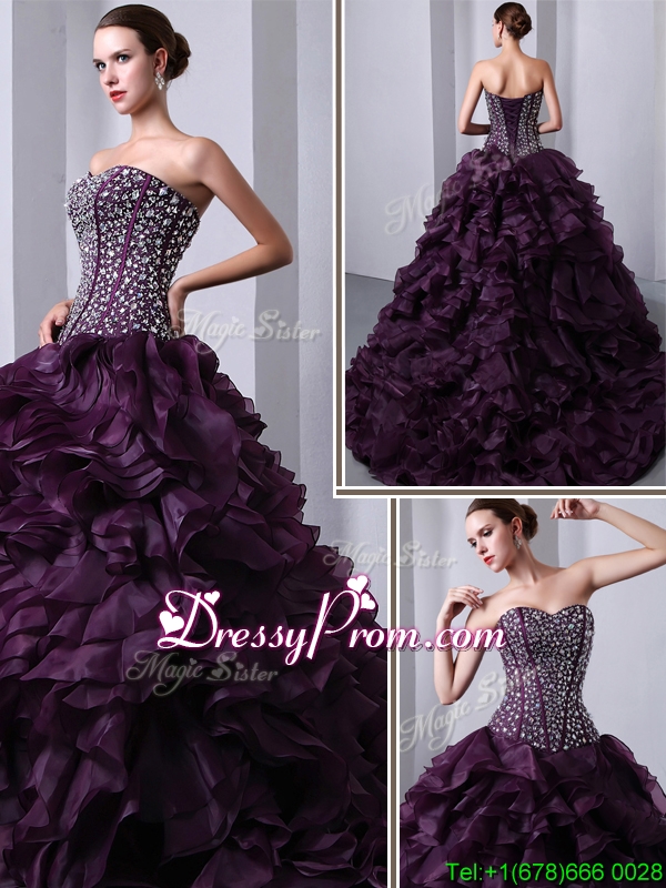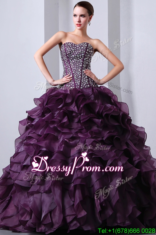 Neckline : SweetheartShown Color : PurpleSilhouette : A-lineSleeve Length : sleevelessHemline : floor lengthBack Detail : Lace upFabric : OrganzaEmbellishment : Beading,RufflesOccasion : Prom,Formal Evening,Military Ball,Sweet 16,QuinceaneraSeason : Spring,Summer,Fall,Winter