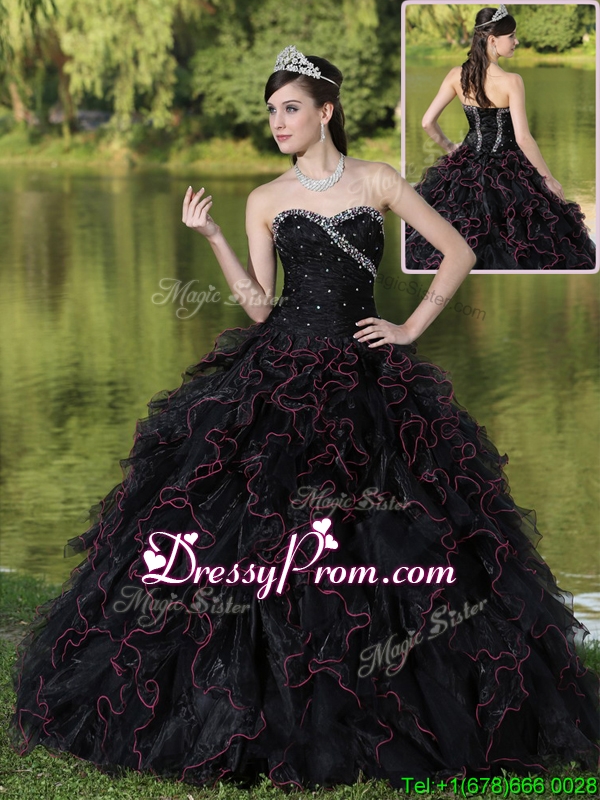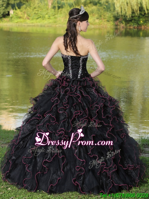 Neckline : SweetheartShown Color : BlackSilhouette : Ball GownsSleeve Length : sleevelessHemline : floor lengthBack Detail : Lace upFabric : Organza,TaffetaEmbellishment : Beading,RufflesOccasion : Prom,Formal Evening,Graduation,Military Ball,Sweet 16,QuinceaneraSeason : Spring,Summer,Fall,Winter