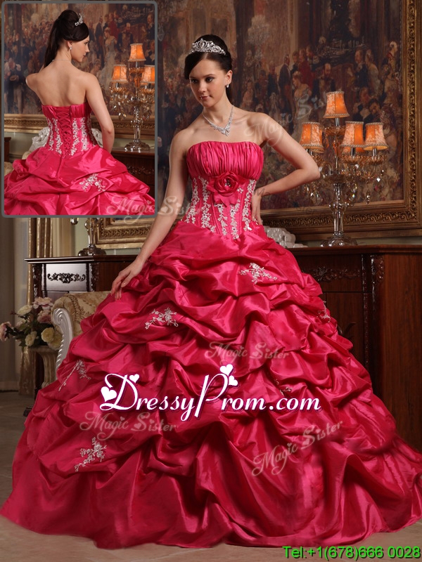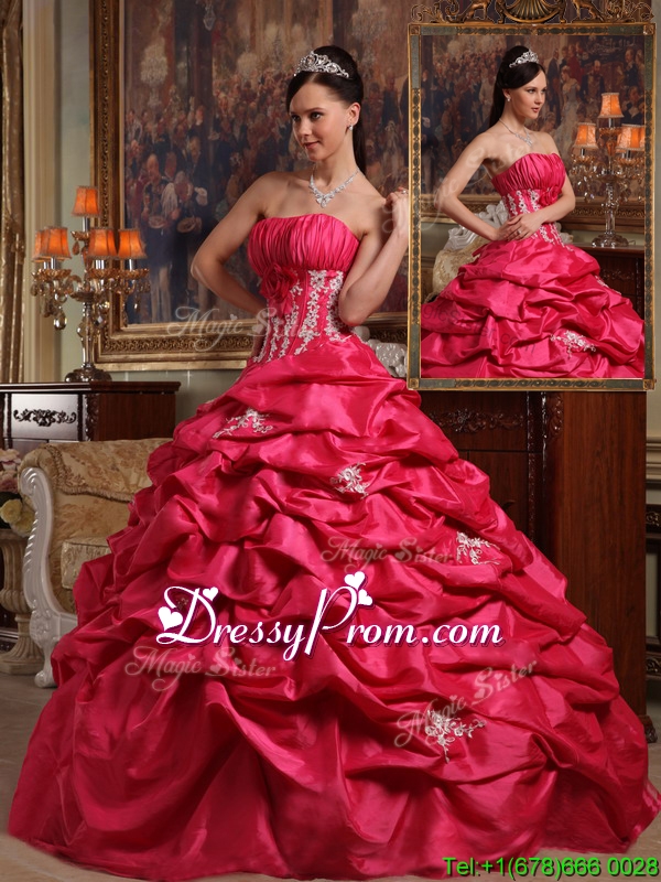 Neckline : StraplessShown Color : Coral RedSilhouette : Ball GownsSleeve Length : sleevelessHemline : floor lengthBack Detail : Lace upFabric : TaffetaEmbellishment : Appliques,Pick UpsOccasion : Prom,Military Ball,QuinceaneraSeason : Spring,Summer,Fall,Winter