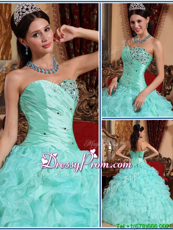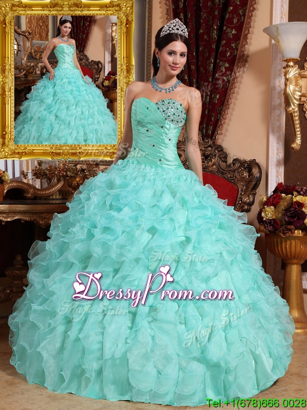 Neckline : SweetheartShown Color : Apple GreenSilhouette : Ball GownsSleeve Length : sleevelessHemline : floor lengthBack Detail : Lace upFabric : OrganzaEmbellishment : Beading,RufflesOccasion : Graduation,Military Ball,Sweet 16,QuinceaneraSeason : Spring,Summer,Fall,Winter