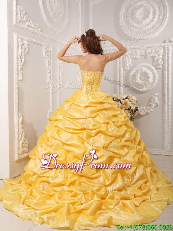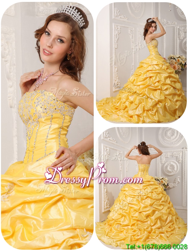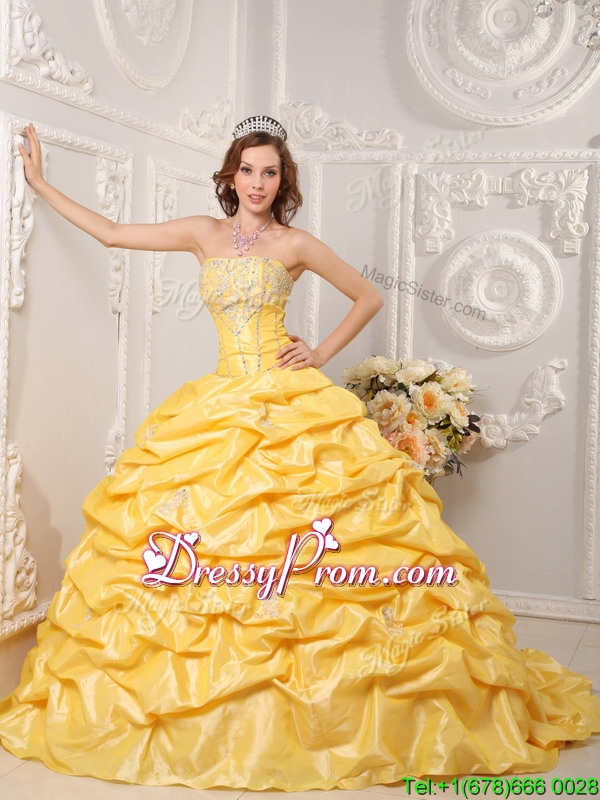 Neckline : StraplessShown Color : YellowSilhouette : Ball GownsSleeve Length : sleevelessHemline : with trainBack Detail : Lace upFabric : TaffetaEmbellishment : Beading,Appliques,Pick UpsOccasion : Prom,Formal Evening,Military Ball,Sweet 16,QuinceaneraSeason : Spring,Summer,Fall,Winter