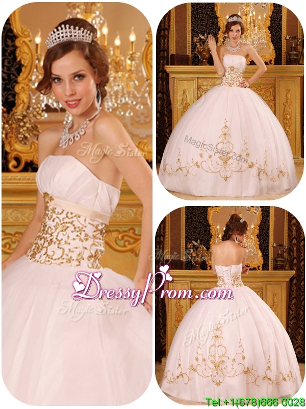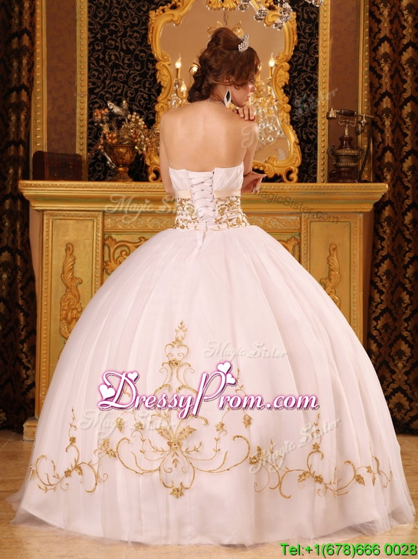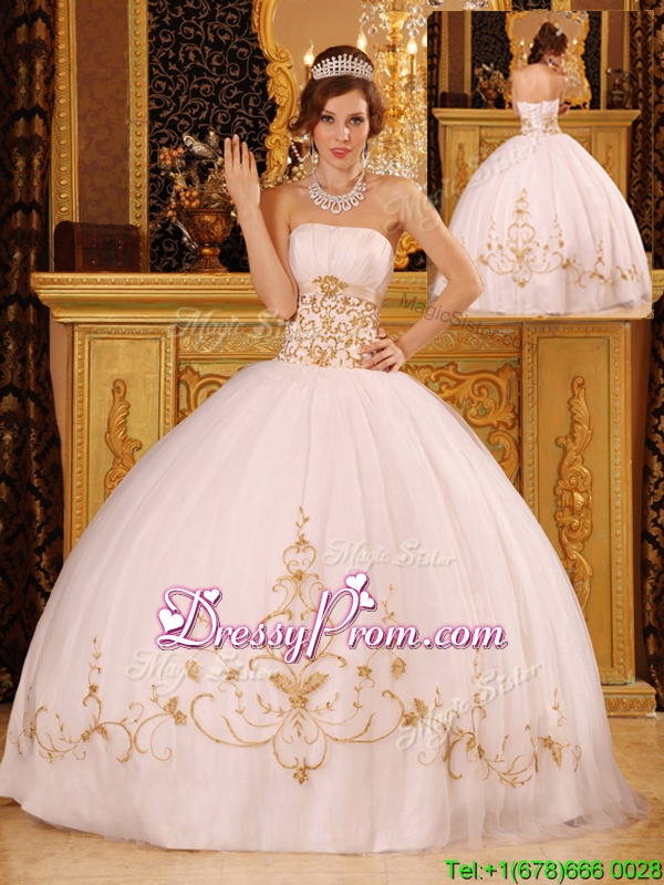Neckline : StraplessShown Color : WhiteSilhouette : Ball GownsSleeve Length : sleevelessHemline : floor lengthBack Detail : Lace upFabric : Satin,OrganzaEmbellishment : AppliquesOccasion : Prom,Formal Evening,Military Ball,QuinceaneraSeason : Spring,Summer,Fall,Winter