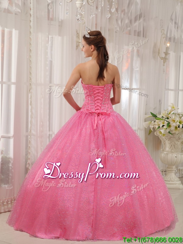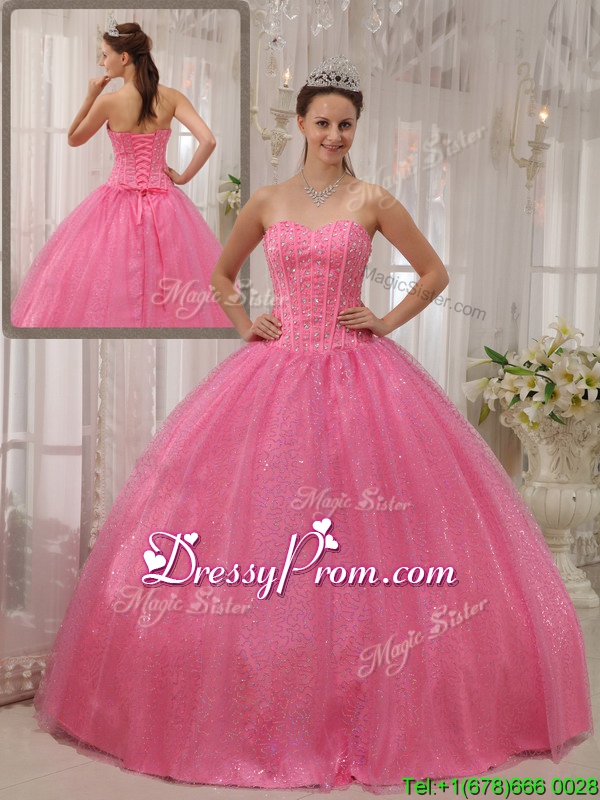 Neckline : SweetheartShown Color : Pink Silhouette : Ball GownsSleeve Length : sleevelessHemline : floor lengthBack Detail : Lace upFabric : Organza,TaffetaEmbellishment : BeadingOccasion : Formal Evening,Military Ball,QuinceaneraSeason : Spring,Summer,Fall,Winter
