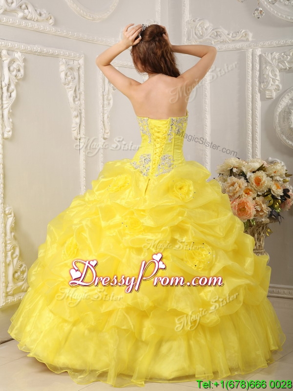 Neckline : StraplessShown Color : YellowSilhouette : Ball GownsSleeve Length : sleevelessHemline : floor lengthBack Detail : Lace upFabric : OrganzaEmbellishment : Beading,RufflesOccasion : Prom,Formal Evening,Military Ball,QuinceaneraSeason : Spring,Summer,Fall,Winter