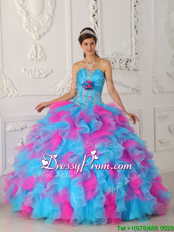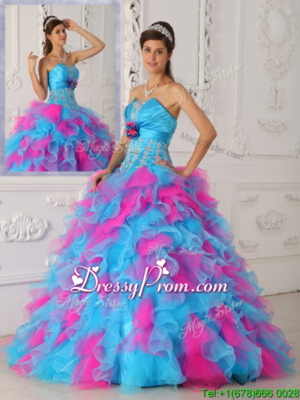 Neckline : StraplessSilhouette : Ball GownsSleeve Length : sleevelessHemline : floor lengthBack Detail : Lace upFabric : OrganzaEmbellishment : Appliques,Hand Made FlowerOccasion : Formal Evening,Military Ball,QuinceaneraSeason : Spring,Summer,Fall,Winter