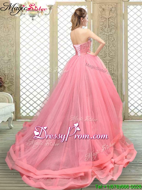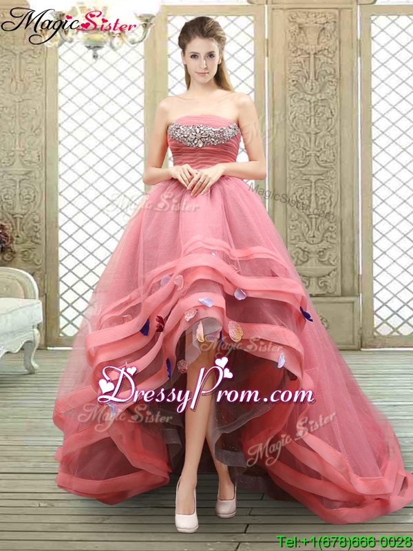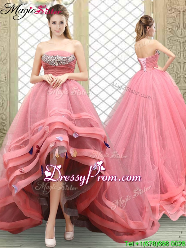 Neckline : StraplessShown Color : Watermelon RedSilhouette : A-lineSleeve Length : sleevelessHemline : high lowBack Detail : Lace upFabric : TulleEmbellishment : Beading,AppliquesOccasion : Military Ball,Sweet 16,QuinceaneraSeason : Spring,Fall,Winter