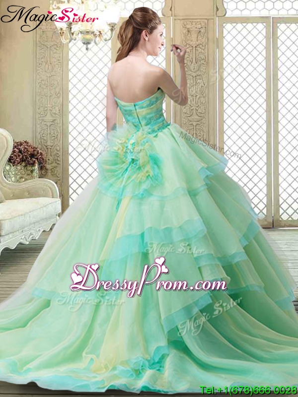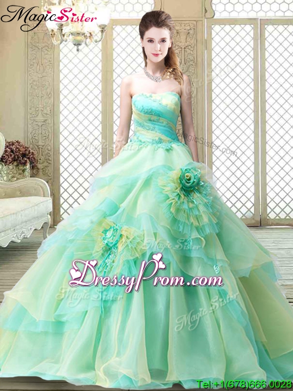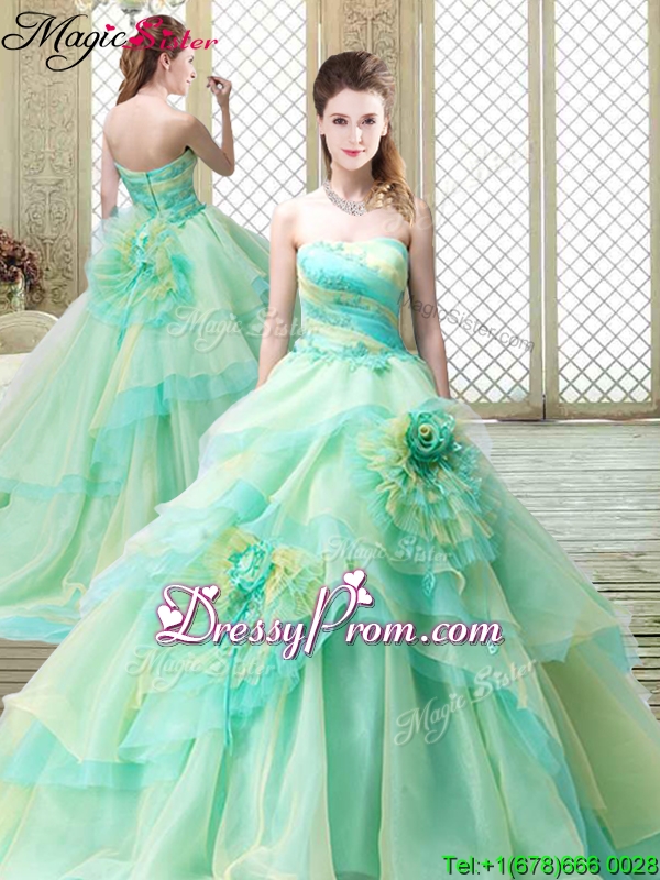 Neckline : StraplessSilhouette : A-lineSleeve Length : sleevelessHemline : with trainBack Detail : ZipperFabric : TulleEmbellishment : Hand Made FlowerOccasion : Military Ball,Sweet 16,QuinceaneraSeason : Spring,Summer,Fall,Winter