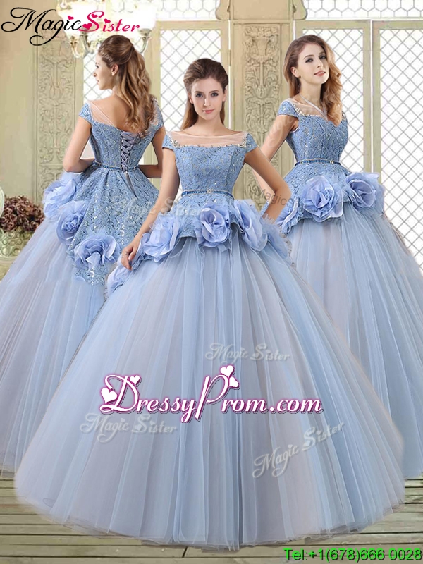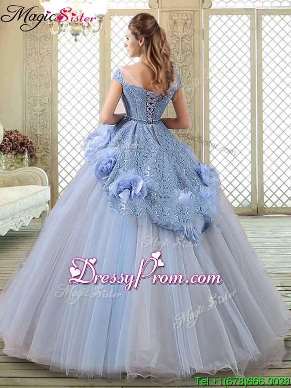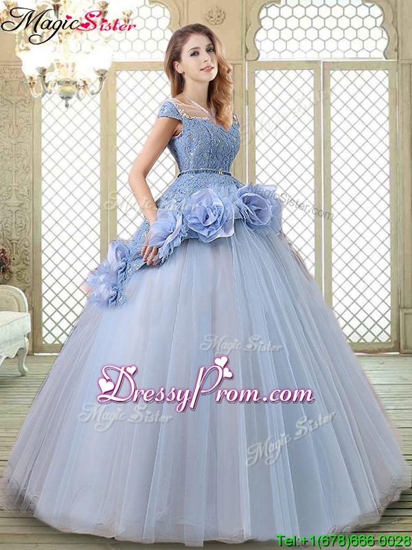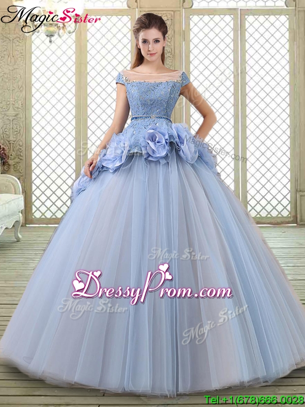 Neckline : BateauShown Color : LavenderSilhouette : Ball GownsSleeve Length : cap sleevesHemline : floor lengthBack Detail : Lace upFabric : TulleEmbellishment : Hand Made FlowerOccasion : Military Ball,Sweet 16,QuinceaneraSeason : Spring,Summer,Fall,Winter