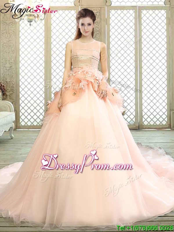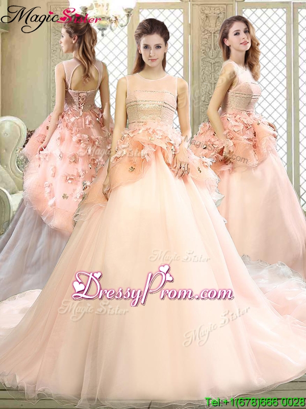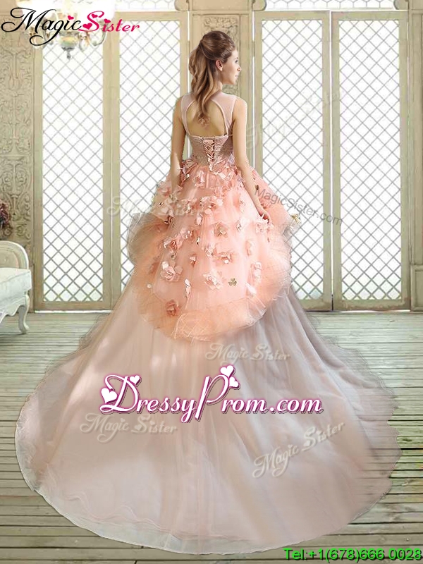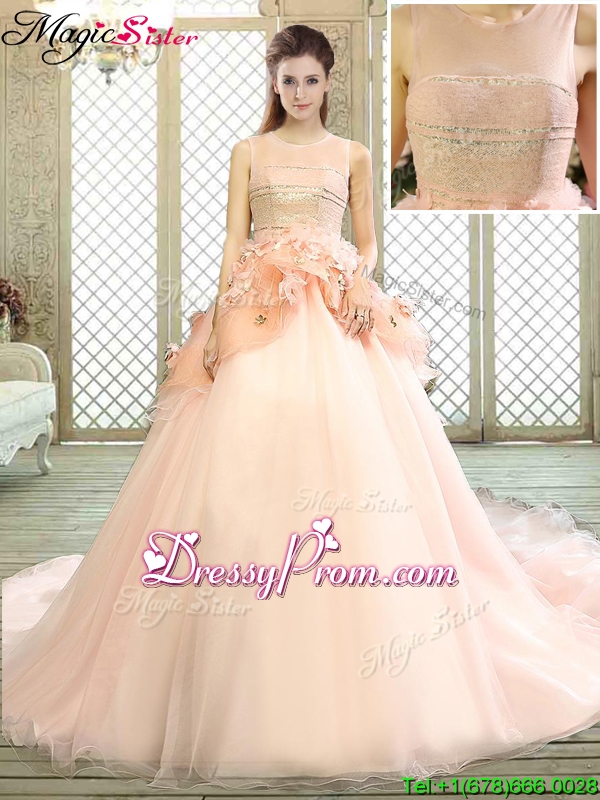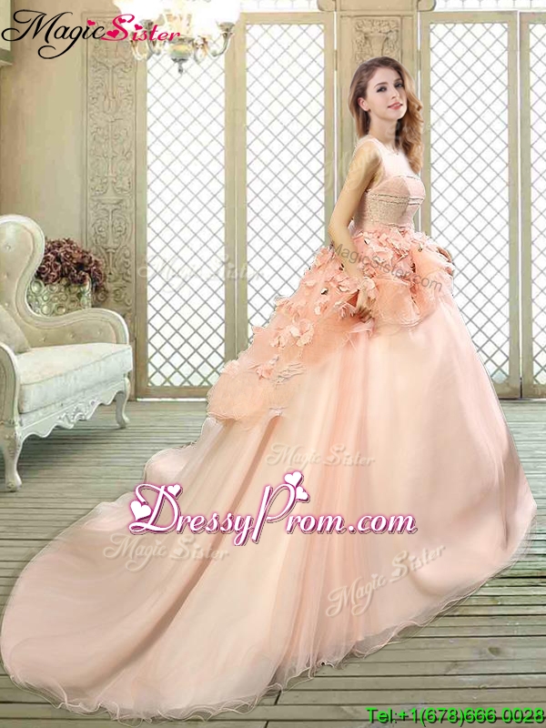 Neckline : ScoopShown Color : Baby PinkSilhouette : Ball GownsSleeve Length : sleevelessHemline : with trainBack Detail : Lace upFabric : OrganzaEmbellishment : Hand Made FlowerOccasion : Military Ball,Sweet 16,QuinceaneraSeason : Spring,Summer,Fall,Winter